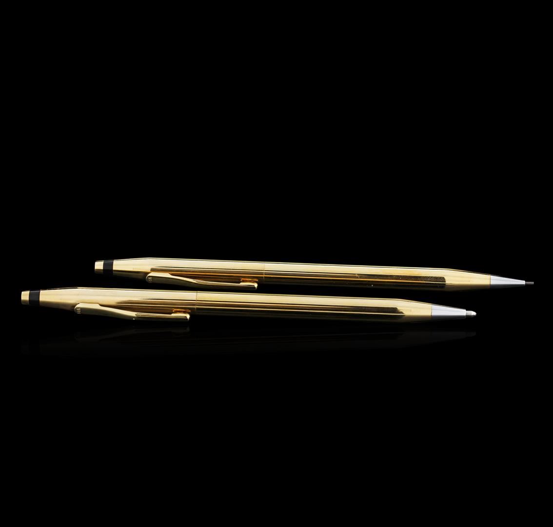 Solid 14k Gold Ball Pen and Pencil Set. Includes original genuine leather box, tags, bags and directions. This set was made for executives in the early 1970's. No longer being made due to high cost of gold. The clips on these pens are solid gold as well not like the newer models that are not. Lifetime Cross Warranty. This "vintage" pen and pencil set is made by CROSS. It is the "perfect gift" for that serious pen collector. This lovely set is made in solid 14kt gold and is not "gold filled", or "rolled in gold" as most Cross pens are today. This is the real deal. The model number of this set is 8001. It comes with the pen and the pencil, and in the original CROSS box.