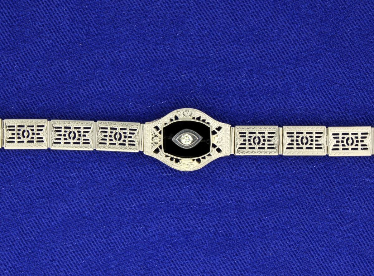 The bracelet is onyx with a 0.04ct single cut diamond in a 14k plate in center of onyx. Approx. 7" long and 1/2" wide at the center. This bracelet has a strong clasp with a hasp safety. The condition is excellent for its age! 7.3g