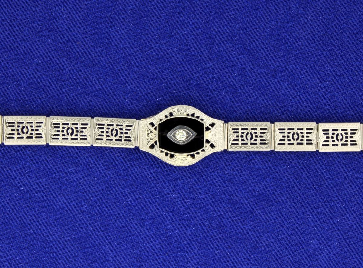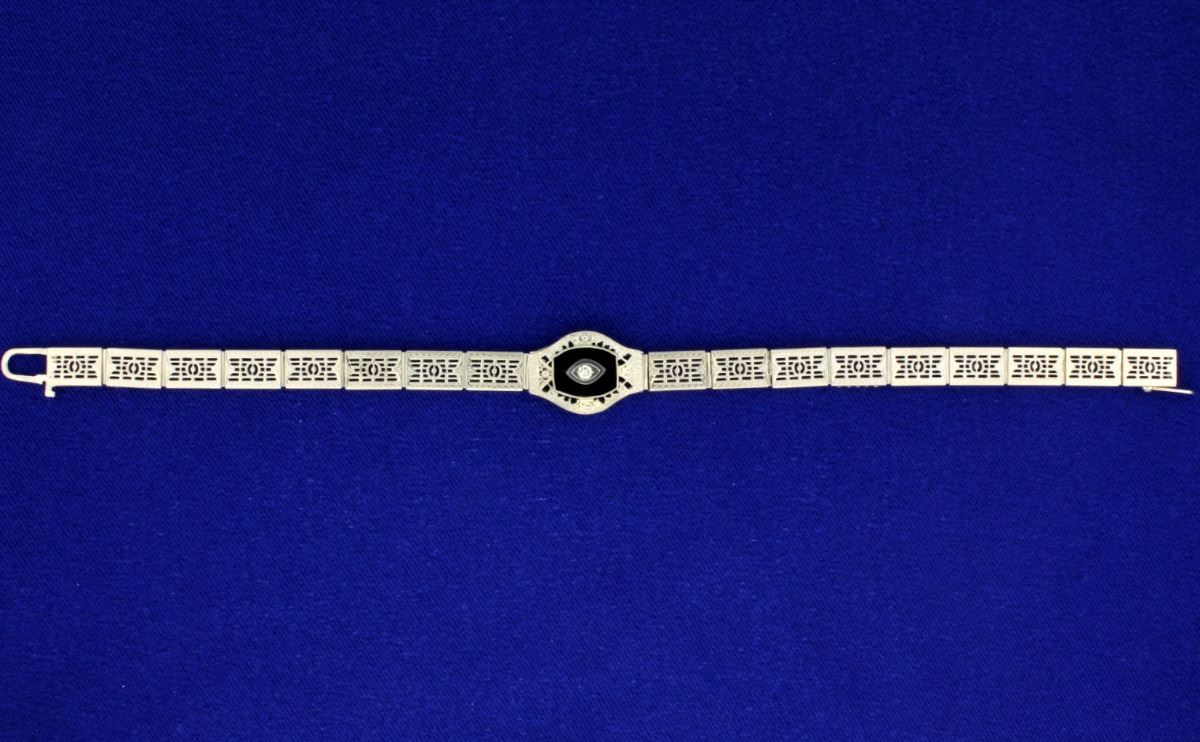 The bracelet is onyx with a 0.04ct single cut diamond in a 14k plate in center of onyx. Approx. 7" long and 1/2" wide at the center. This bracelet has a strong clasp with a hasp safety. The condition is excellent for its age! 7.3g