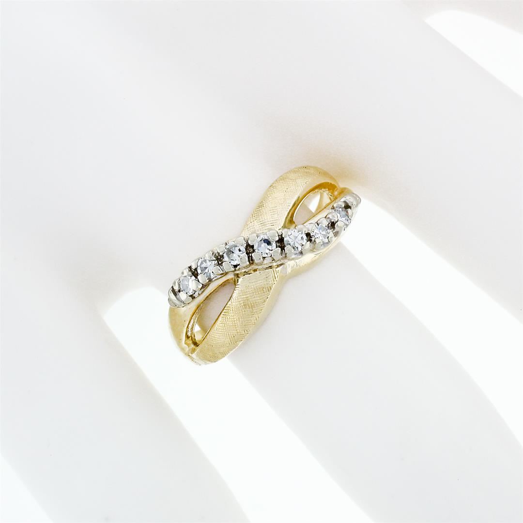 A vinatge solid 14k two tone gold wavy infinity band ring with 7 natural diamonds (F/G - VVS2/VS1; 0.20ctw). The ring is size 6.5, weighs a total of 4.75 grams, and measures 7.50mm wide.