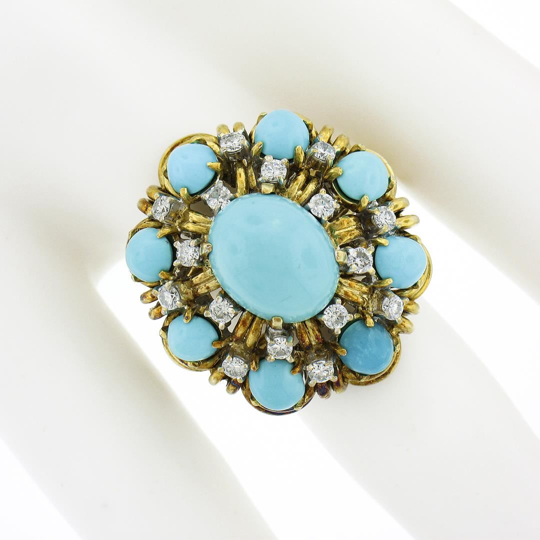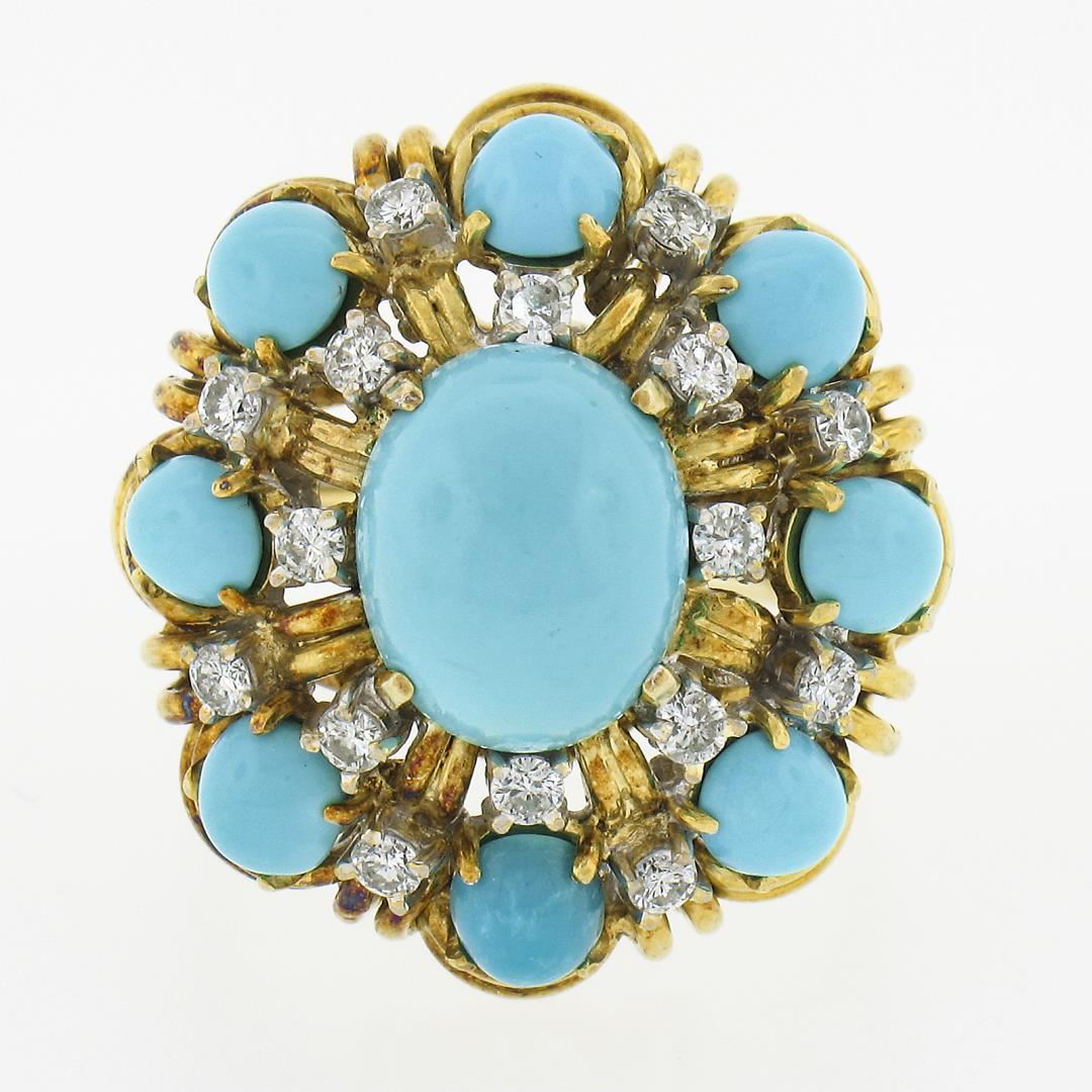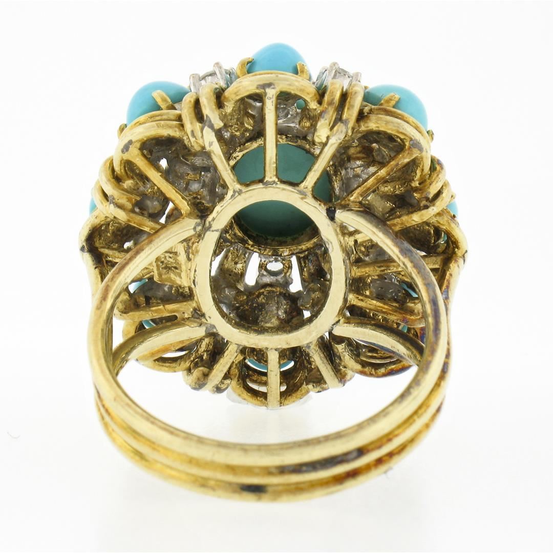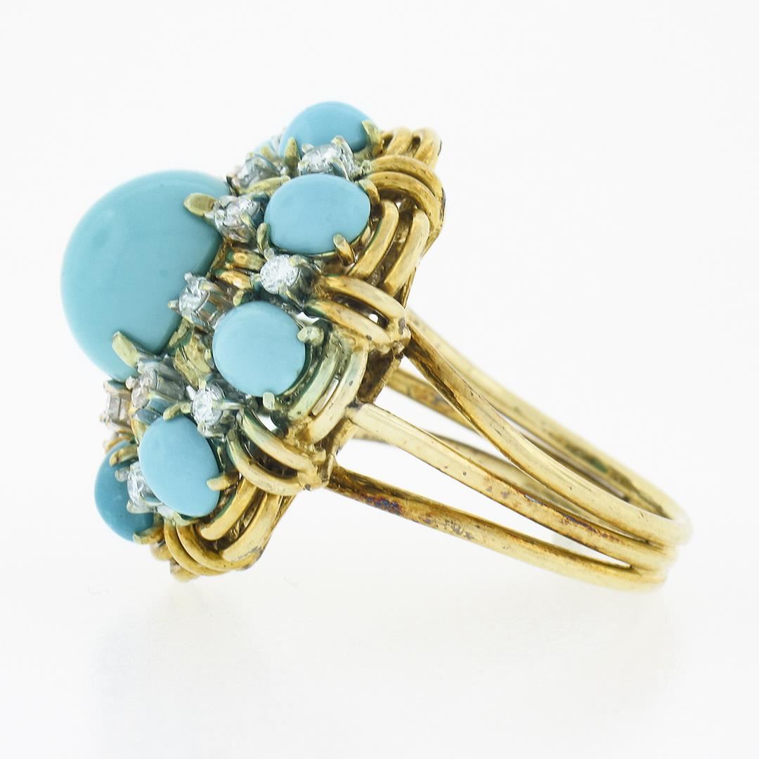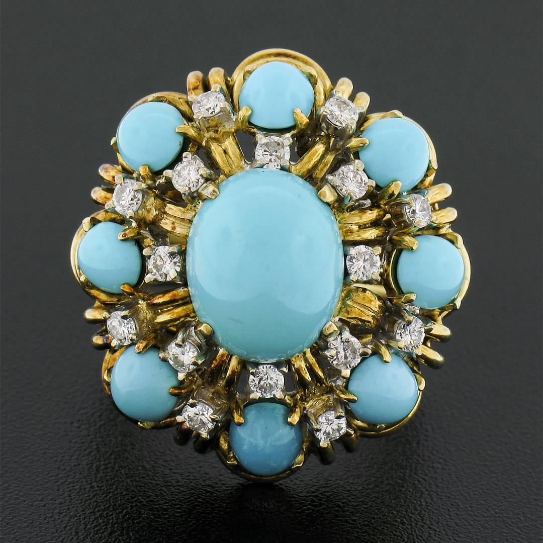 A vintage solid 14k yellow gold cockatil ring, with 9 oval cabochon cut natural turquoises ((1)10.9x8.8mm & (8) 5.1x4.1mm each), and 16 round brilliant cut natural diamonds (G/H  - VS1/VS2 ; 0.52ctw). The ring is size 7.5, weighs a total of 13.35 grams, and measures 25mm wide.