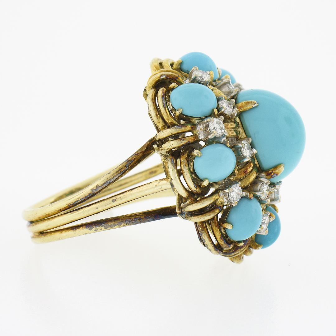 A vintage solid 14k yellow gold cockatil ring, with 9 oval cabochon cut natural turquoises ((1)10.9x8.8mm & (8) 5.1x4.1mm each), and 16 round brilliant cut natural diamonds (G/H - VS1/VS2 ; 0.52ctw). The ring is size 7.5, weighs a total of 13.35 grams, and measures 25mm wide.
