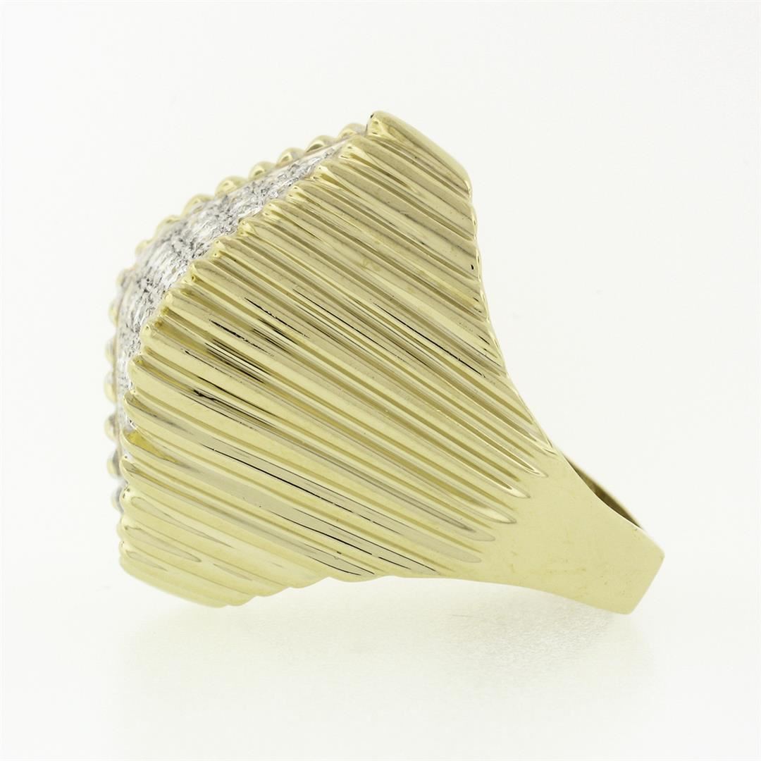 A vintage solid 14k yellow & white gold cocktail ring, with 30 round brilliant cut natural diamonds (F/G- VVS2/VS1 ; 1.20 ctw). The ring is size 7, weighs a total of 12.94 grams, and measures 26.1mm wide.