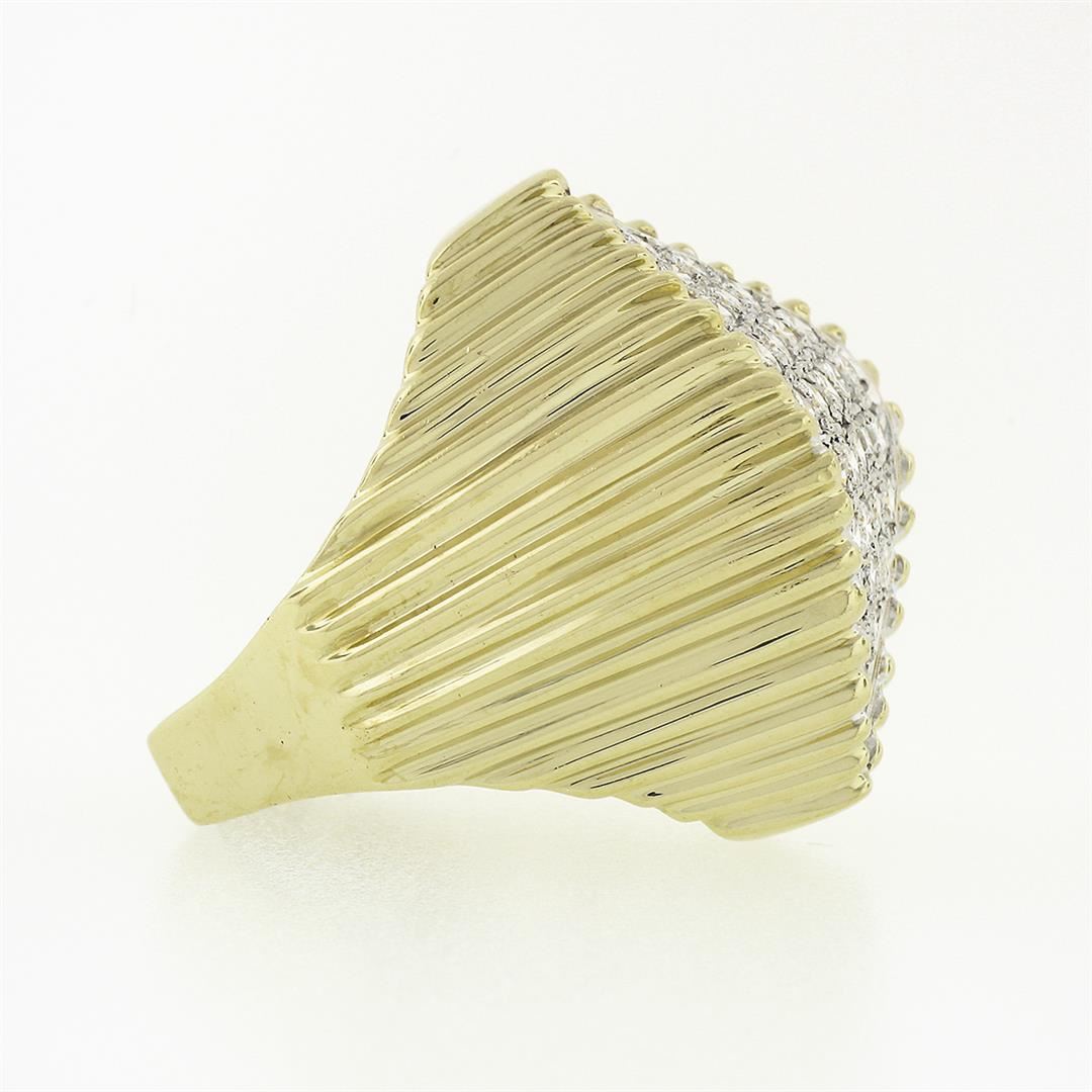 A vintage solid 14k yellow & white gold cocktail ring, with 30 round brilliant cut natural diamonds (F/G- VVS2/VS1 ; 1.20 ctw). The ring is size 7, weighs a total of 12.94 grams, and measures 26.1mm wide.