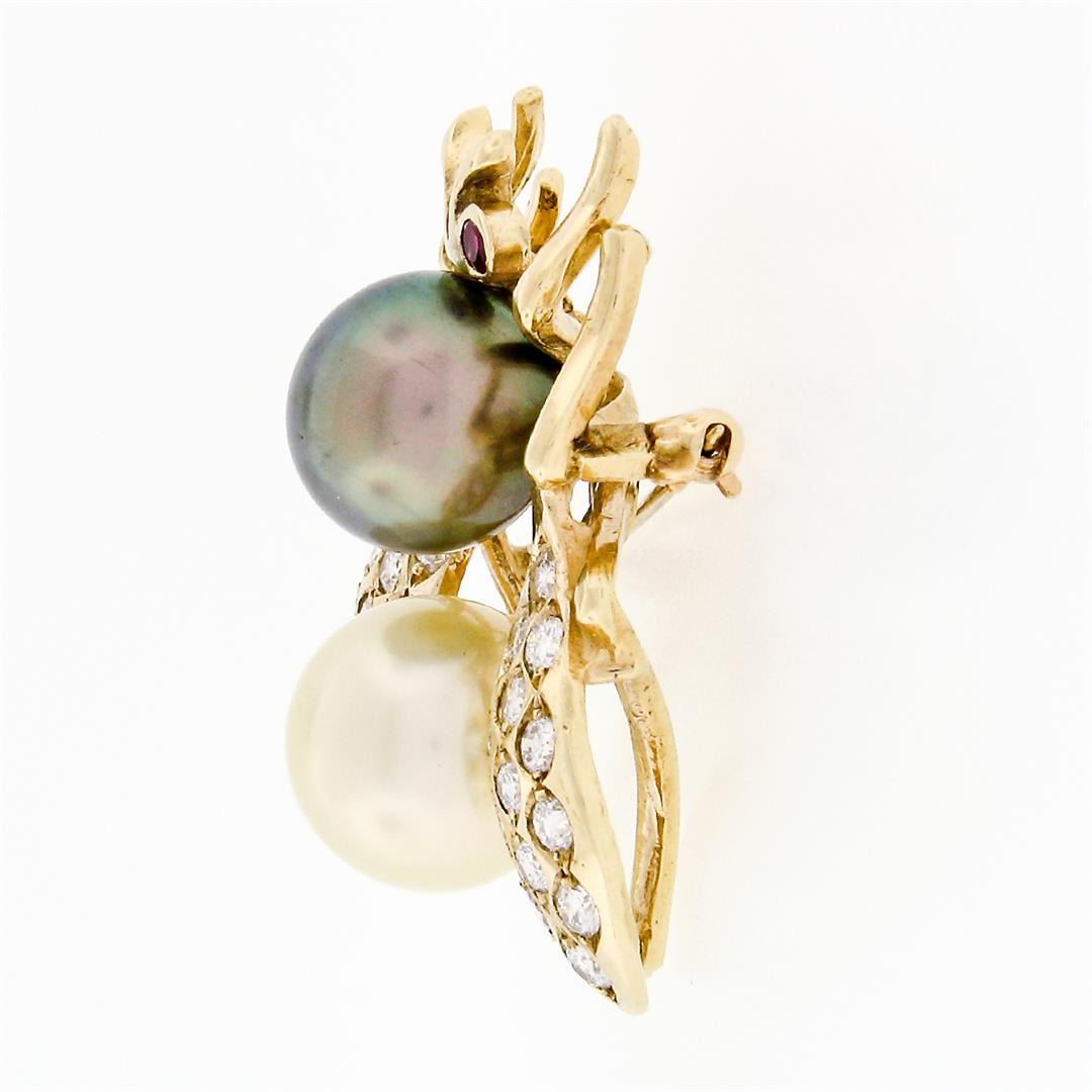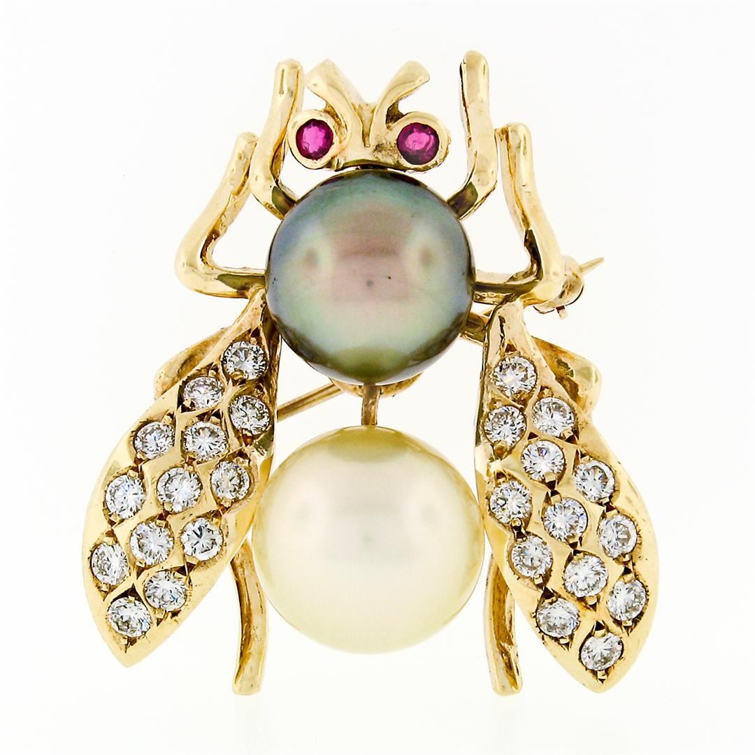 A vintage solid 14k yellow gold bee pin brooch, with 1 round tahitian pearl (11.2mm), 1 round cultured pearl (12.2mm ), 2 round brilliant rubies (0.14ctw), and 26 round brilliant natural diamonds (E/F - VVS2/VS1 ; 1.30ctw). Measures 35x30.8mm and weighs a total of 12.77 grams.