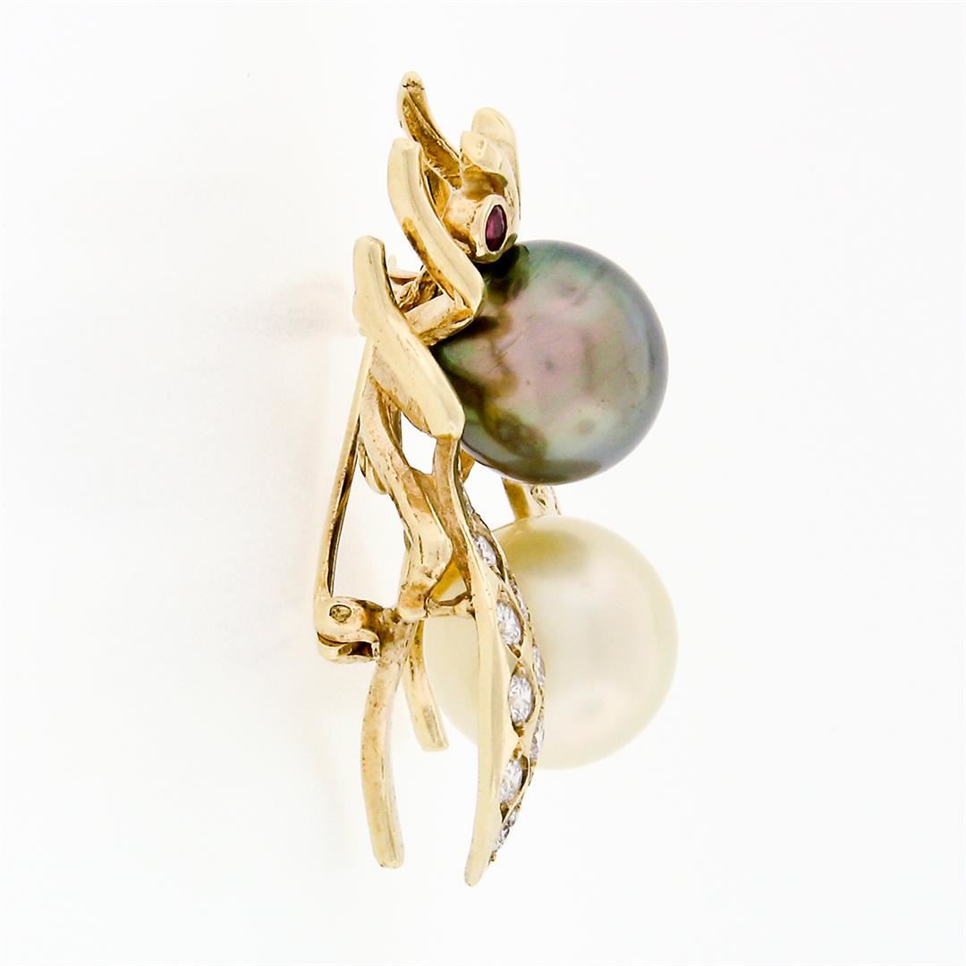 A vintage solid 14k yellow gold bee pin brooch, with 1 round tahitian pearl (11.2mm), 1 round cultured pearl (12.2mm ), 2 round brilliant rubies (0.14ctw), and 26 round brilliant natural diamonds (E/F - VVS2/VS1 ; 1.30ctw). Measures 35x30.8mm and weighs a total of 12.77 grams.