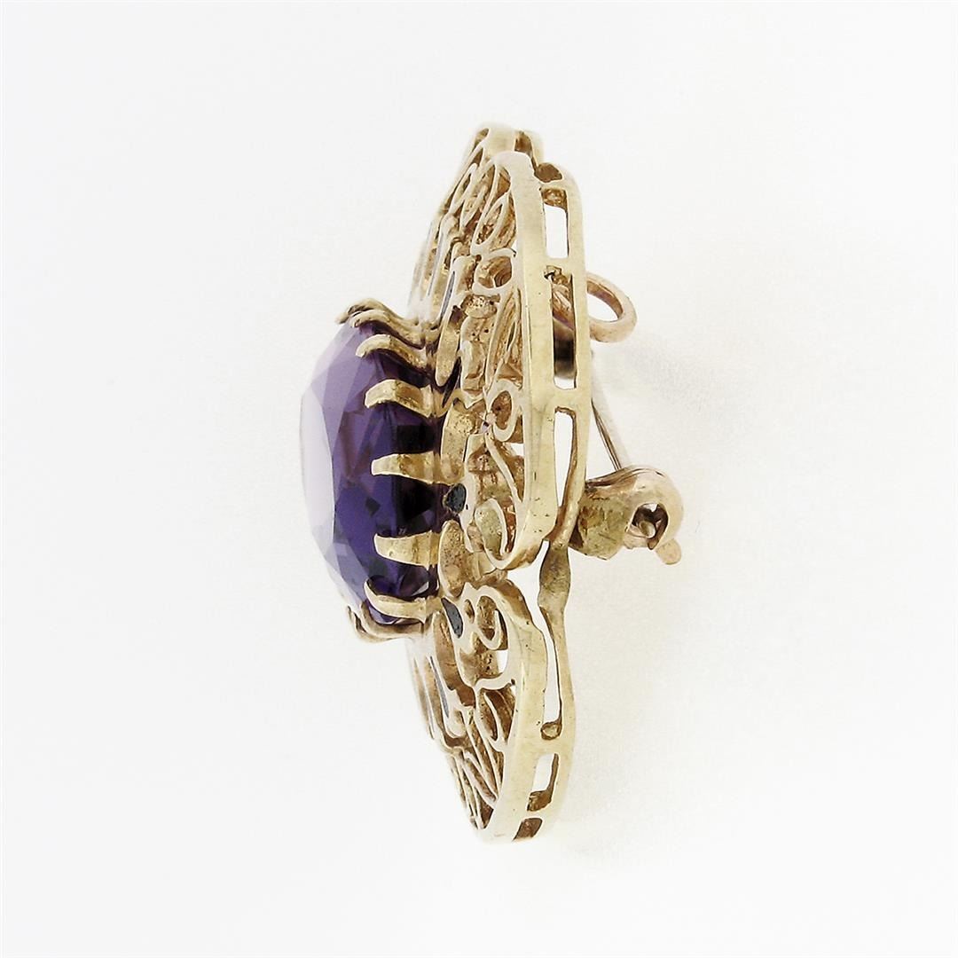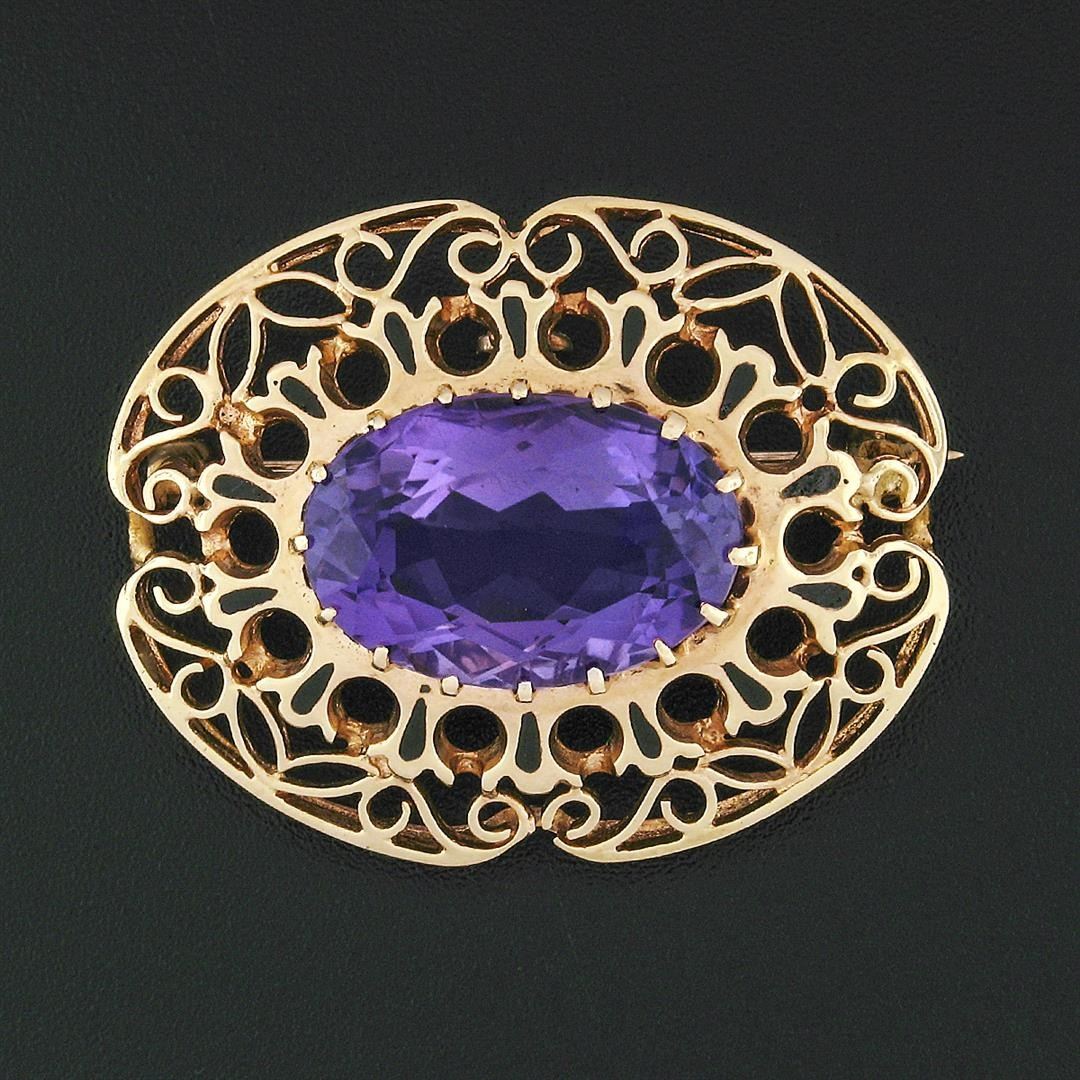 a vintage solid 14k yellow gold pendant pin brooch, with 1 elongated oval brilliant cut natural amethyst (19.8x13.6mm - 13.0ct ). Measures 31x38.75mm and weighs a total of 14.0 grams.