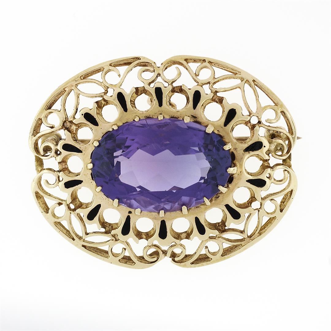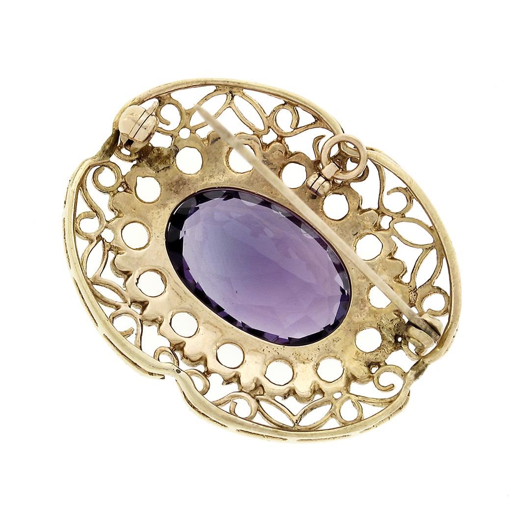 a vintage solid 14k yellow gold pendant pin brooch, with 1 elongated oval brilliant cut natural amethyst (19.8x13.6mm - 13.0ct ). Measures 31x38.75mm and weighs a total of 14.0 grams.