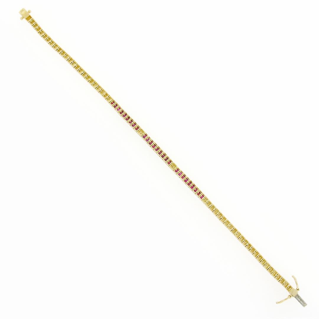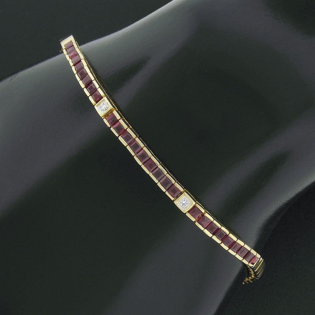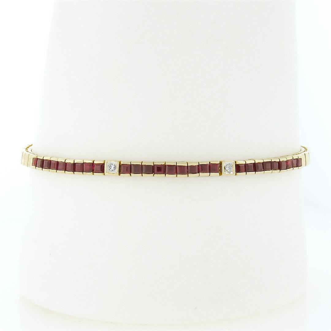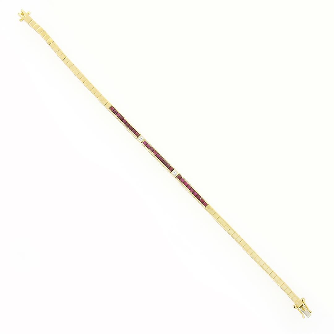 A solid 14k yellow gold square link line bracelet, with 27 square step cut natural rubies (2.0ctw ), and 2 round brilliant cut natural diamonds (G/H - VS1/VS2 ; 0.03ctw). It weighs a total of 9.29 grams, measures 3mm wide, and measures 7 inches in length.