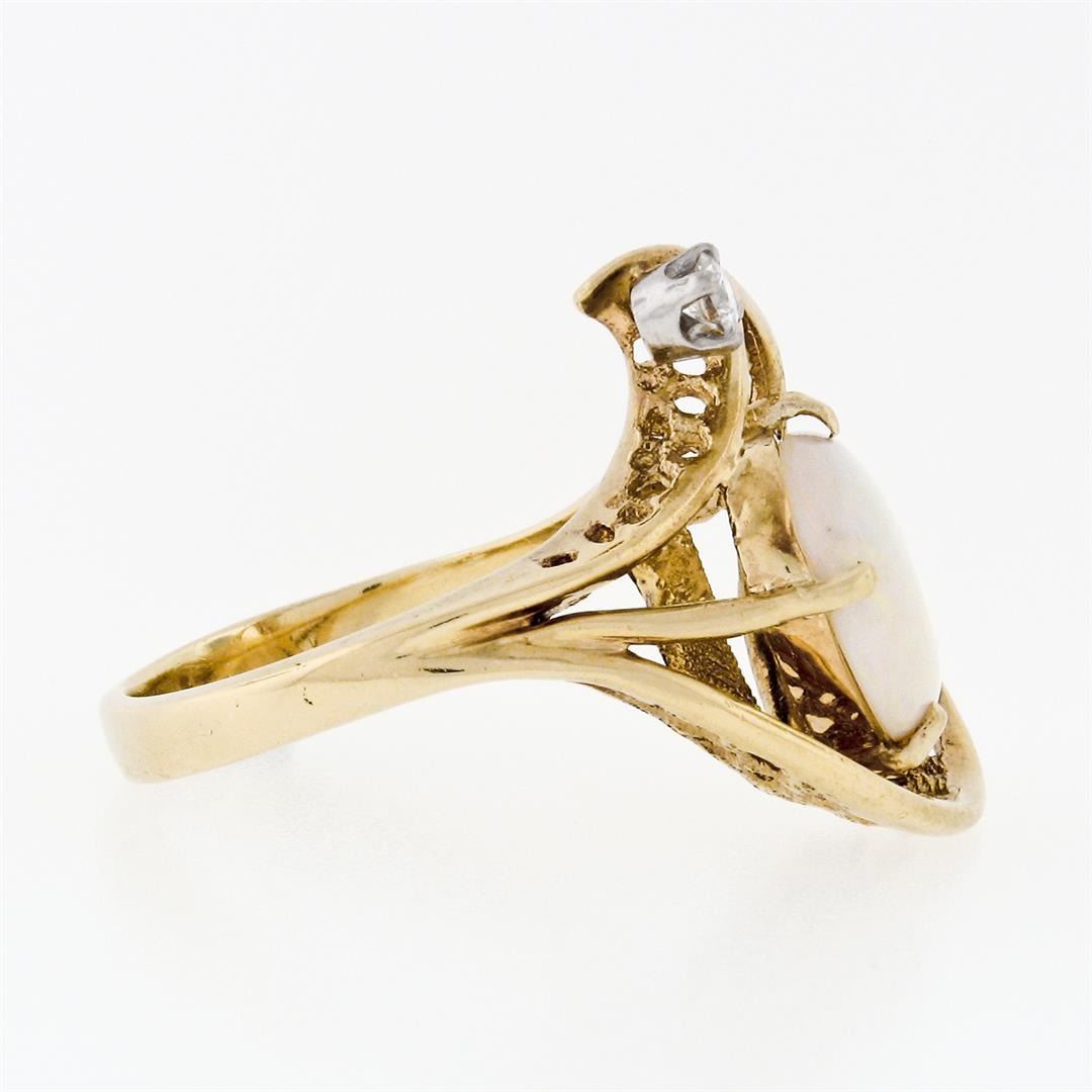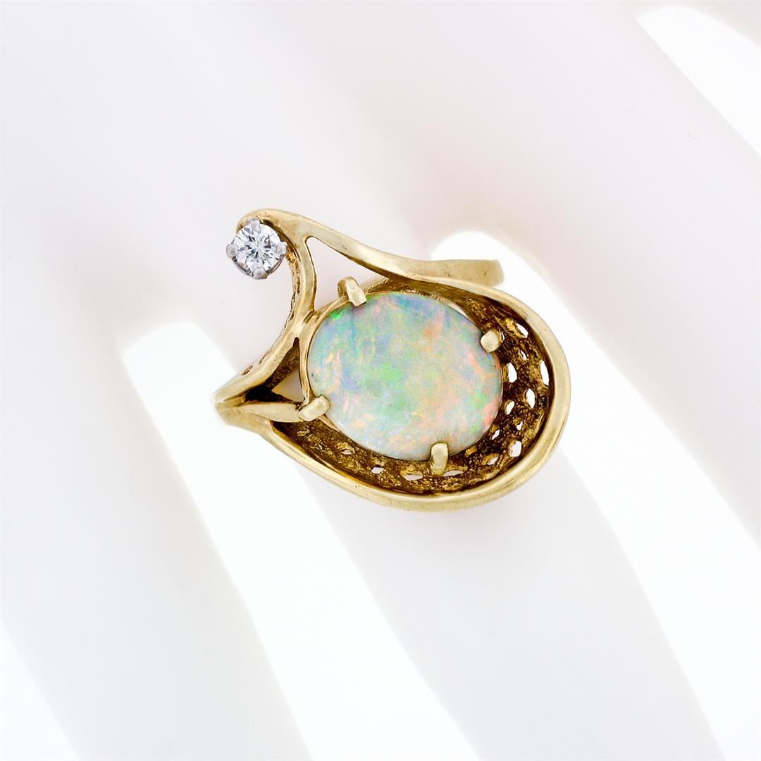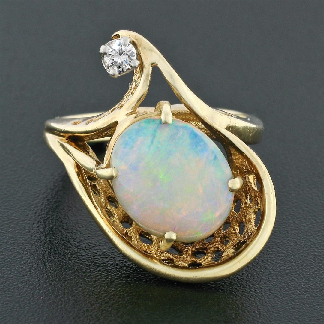 A vintage solid 14k yellow gold ring with 1 oval cut natural opal (11.39x9.34mm; 2.00ct) and 1 round brilliant cut natural diamond (H - VS1; 0.07ct). The ring is size 6.0, weighs a total of 6.13 grams, and measures 21.25mm wide.