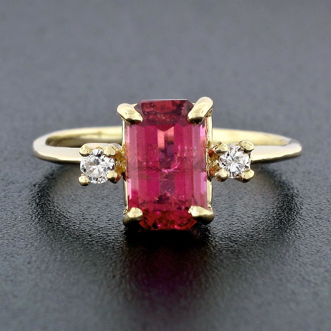 A vintage solid 14k yellow gold three stones ring, with 1 long emerald cut natural tourmaline (9.59x5.89mm - 2.08ct), and 2 round brilliant cut natural diamonds (G - VS2; 0.12ctw). The ring is size 8.5, weighs a total of 2.83 grams, and measures 9.67mm wide.