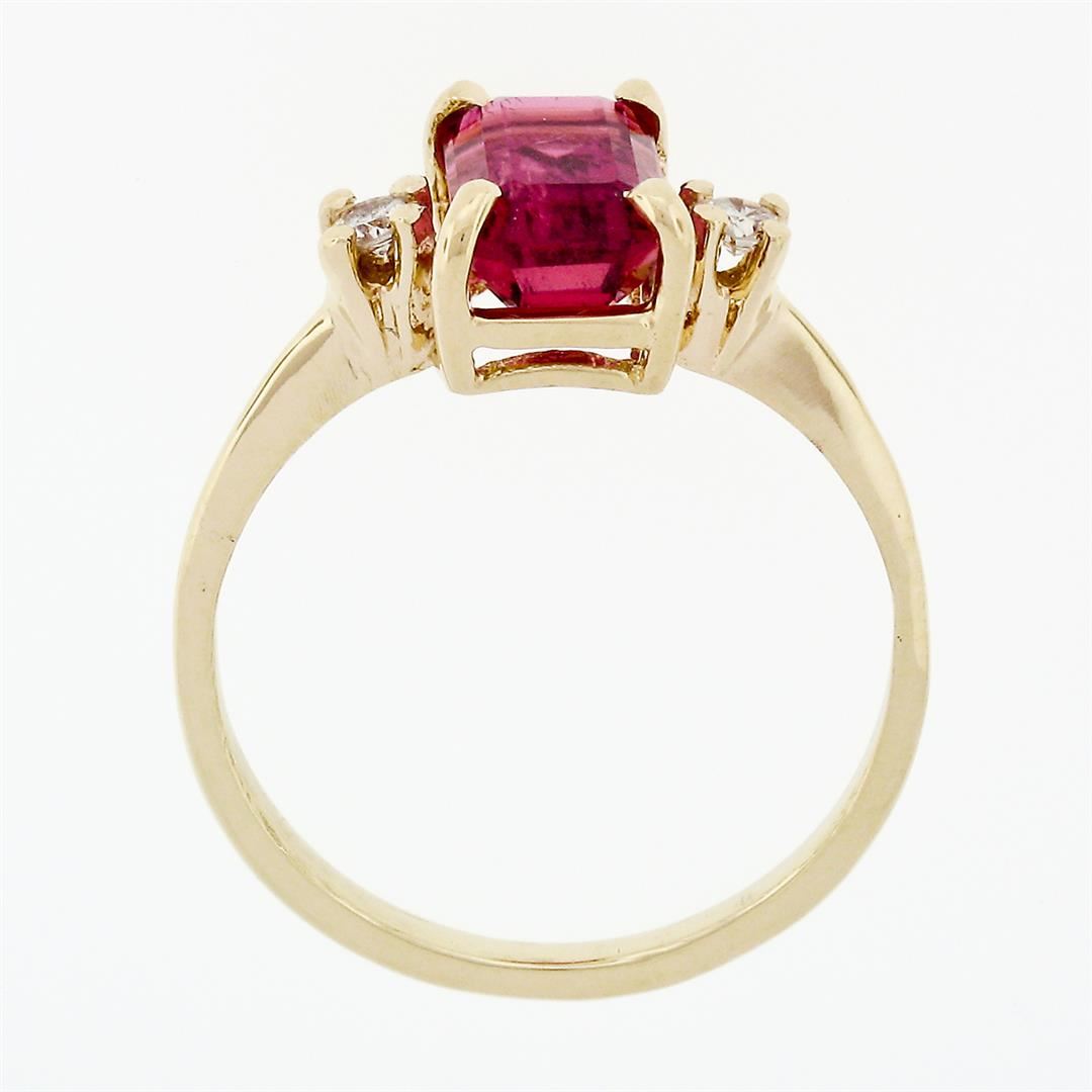 A vintage solid 14k yellow gold three stones ring, with 1 long emerald cut natural tourmaline (9.59x5.89mm - 2.08ct), and 2 round brilliant cut natural diamonds (G - VS2; 0.12ctw). The ring is size 8.5, weighs a total of 2.83 grams, and measures 9.67mm wide.