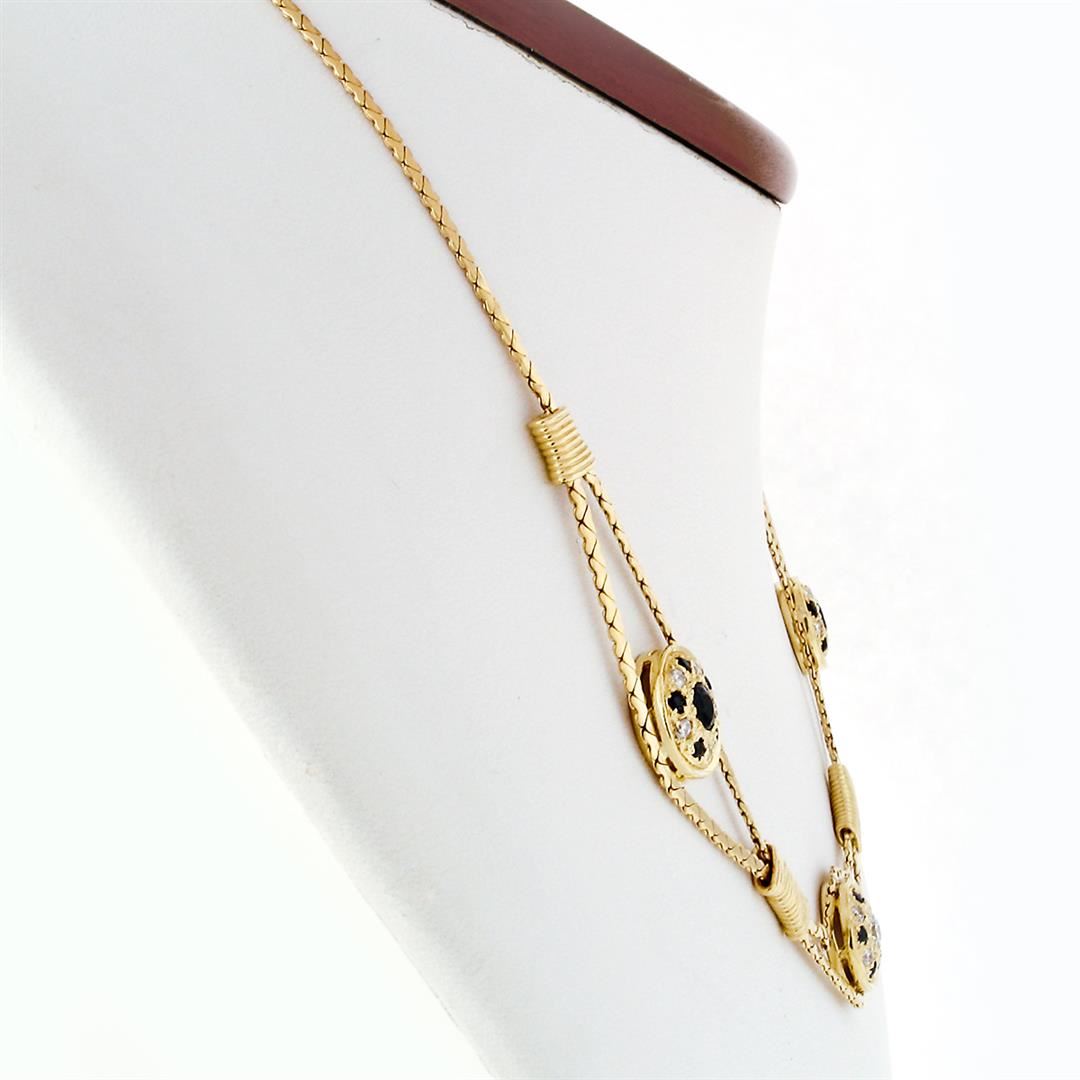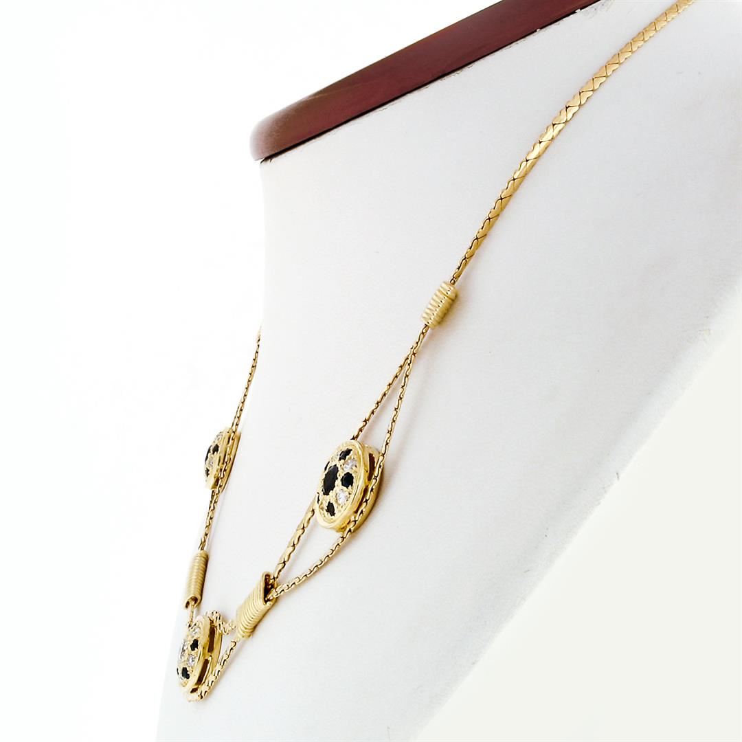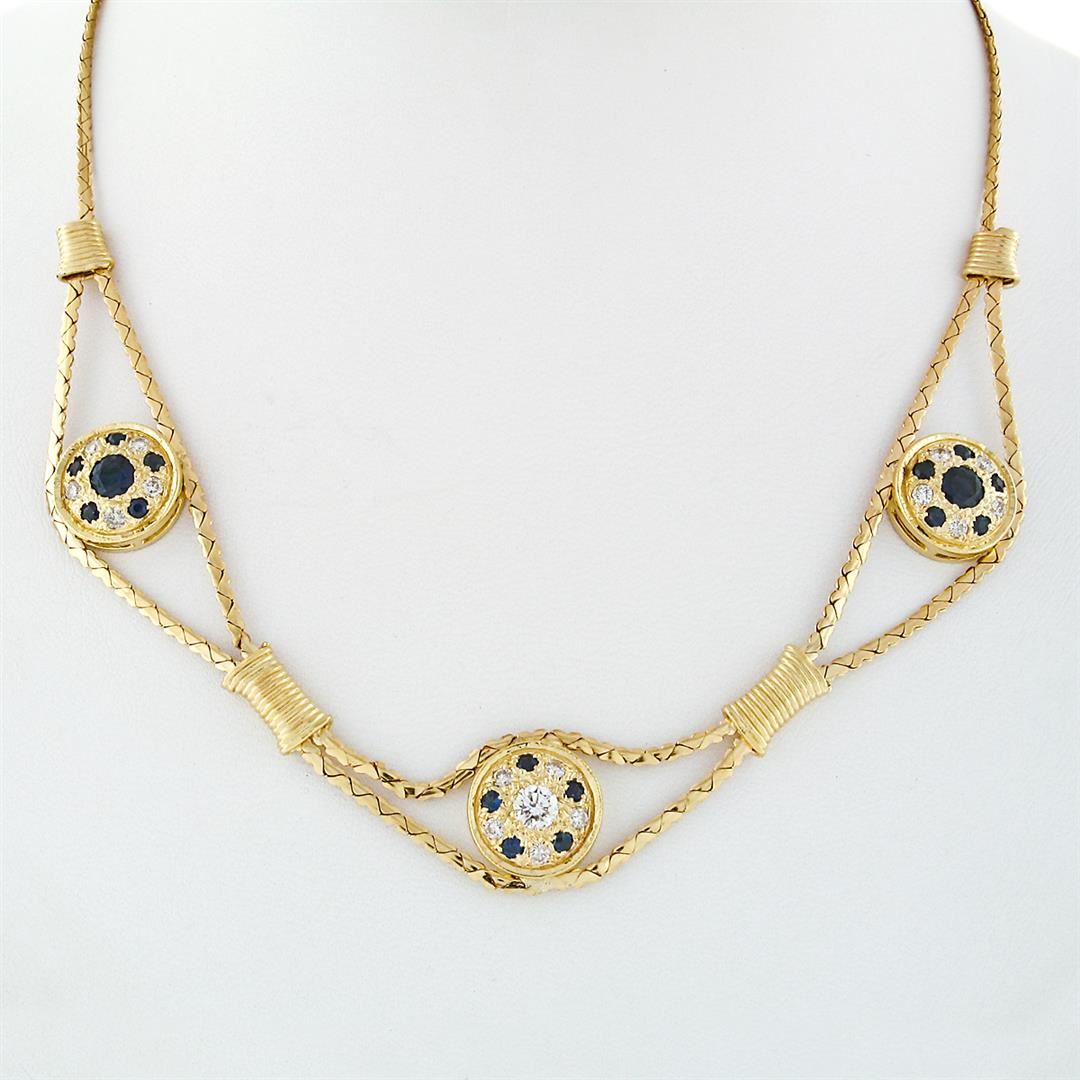 A vintage solid 14k yellow gold statement necklace, with 17 round cut natural sapphire (1.60ctw), and 16 round brilliant cut natural diamonds (F/G - VS1/VS2; 0.68ctw). 16 inch heart shaped serpentine style link chain, 17.50 grams total weight, pendant measures 147.05x51.22mm.
