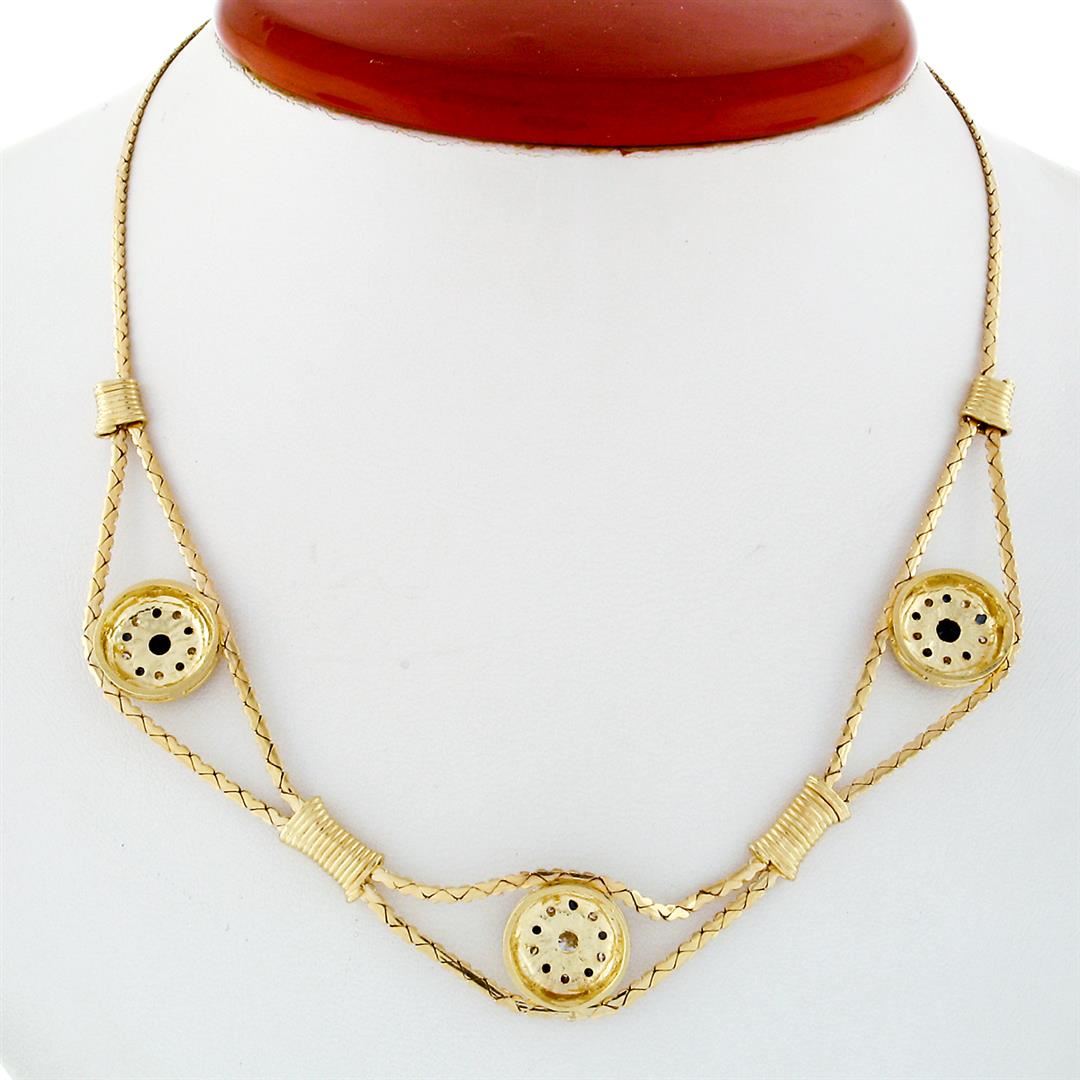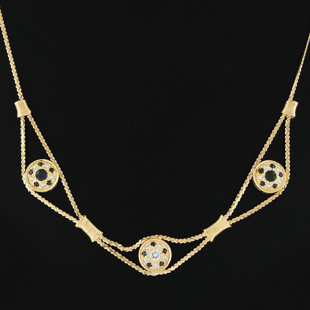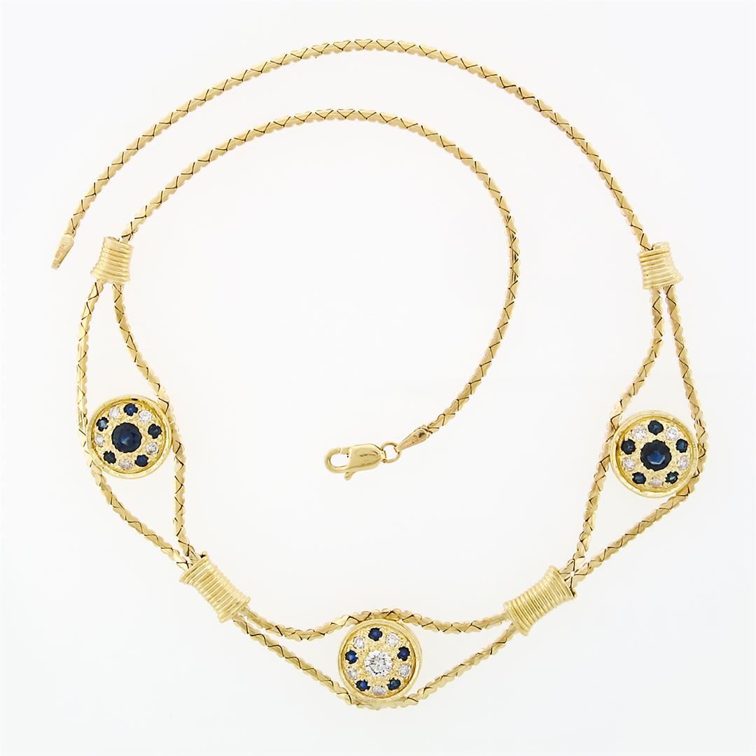 A vintage solid 14k yellow gold statement necklace, with 17 round cut natural sapphire (1.60ctw), and 16 round brilliant cut natural diamonds (F/G - VS1/VS2; 0.68ctw). 16 inch heart shaped serpentine style link chain, 17.50 grams total weight, pendant measures 147.05x51.22mm.