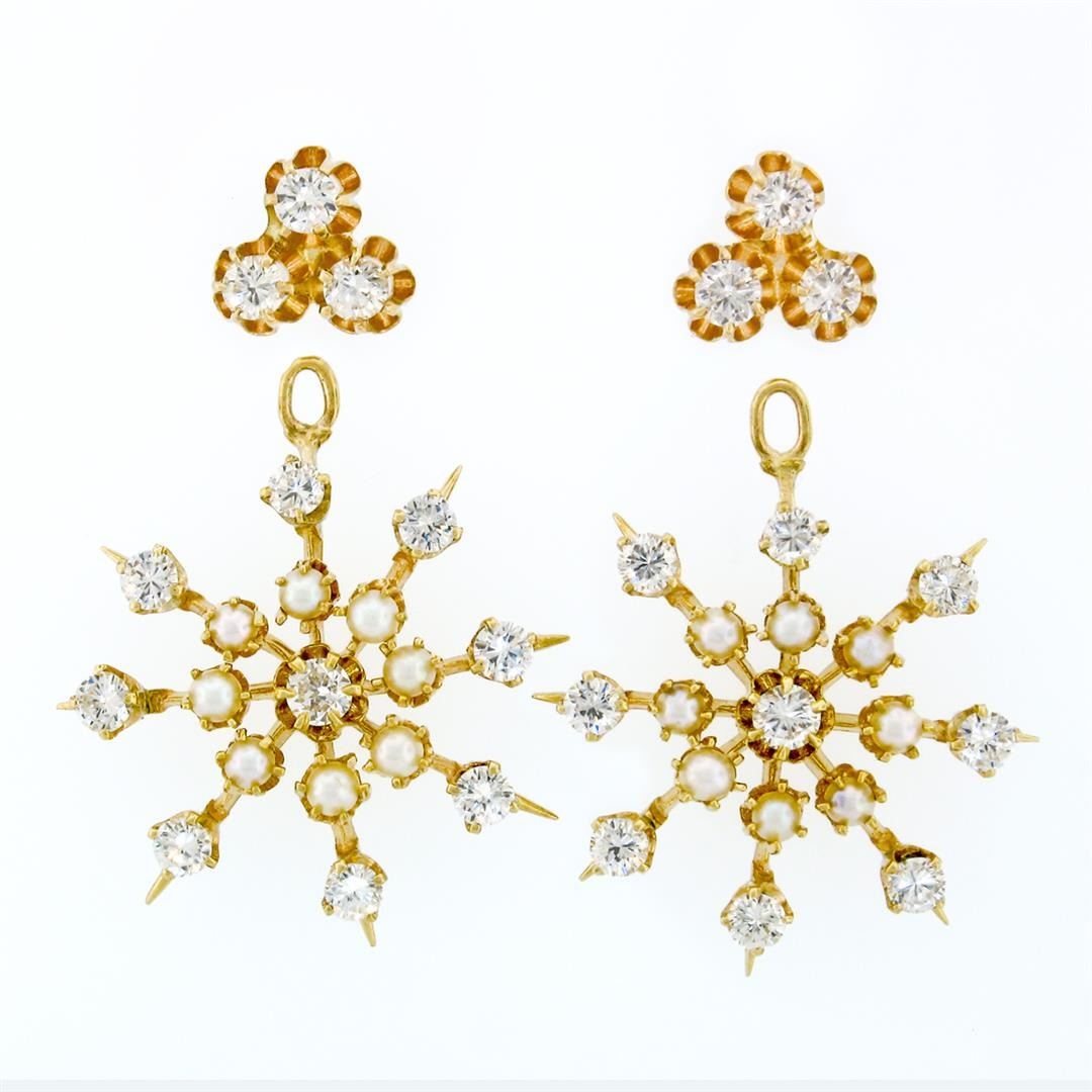 A vintage pair of solid 14k yellow gold earrings with 24 natural diamonds (G/H - VVS2/VS2; 2.75ctw) and 8 cultured pearls (2.5mm). The earrings measure approximately 32.96x25.13mm and weigh a total of 9.00 grams.
