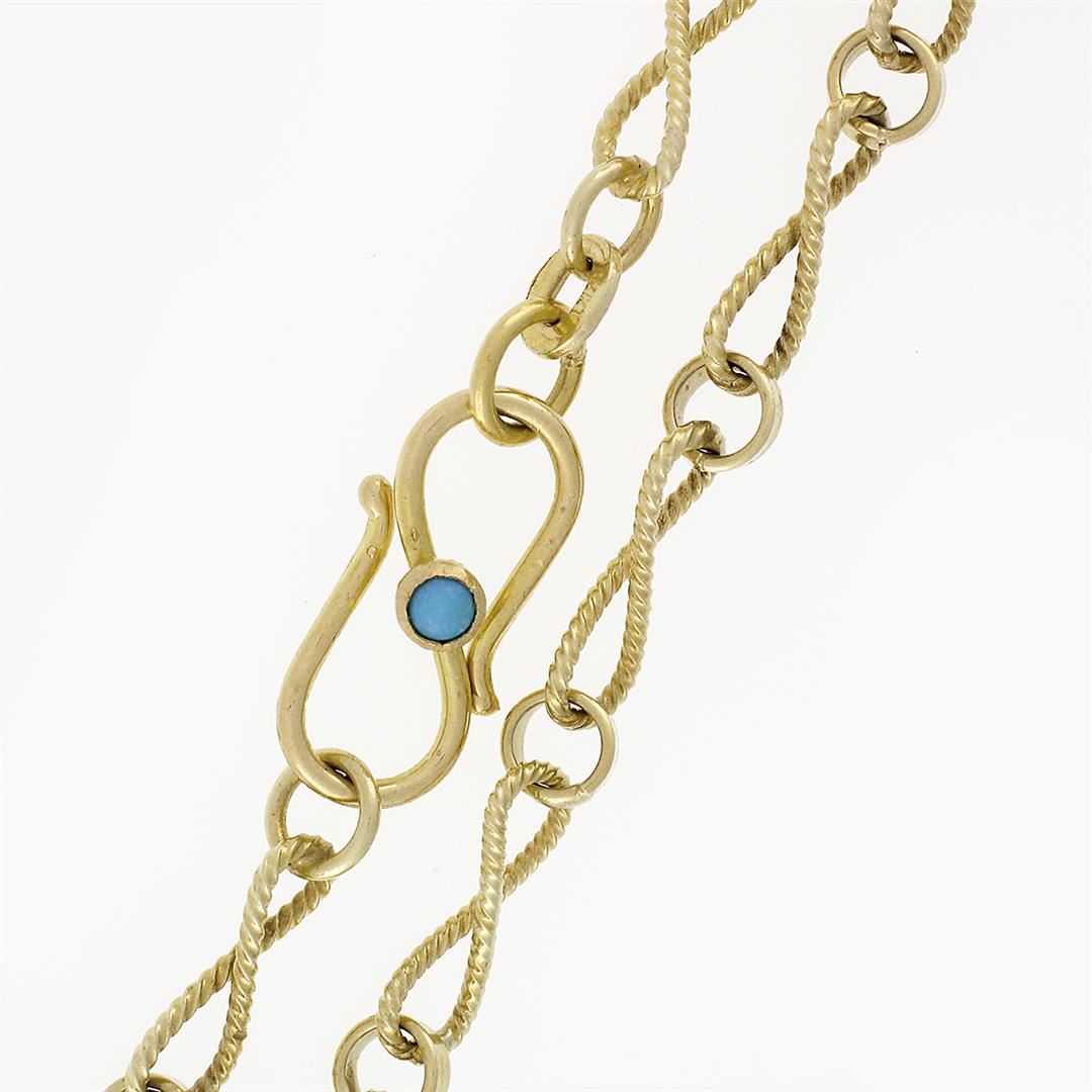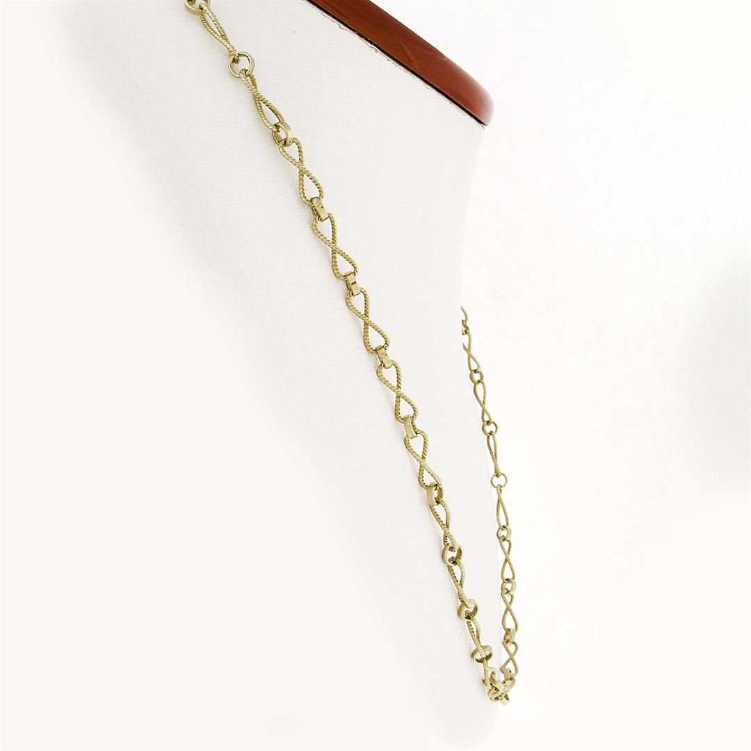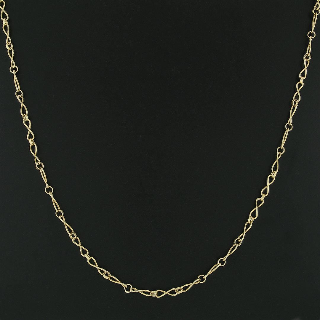 A vintage solid 14k yellow gold infinity twisted wire link chain necklace. It weighs a total of 12.04 grams, measures 4.2mm wide, and measures 21.5 inches in length.