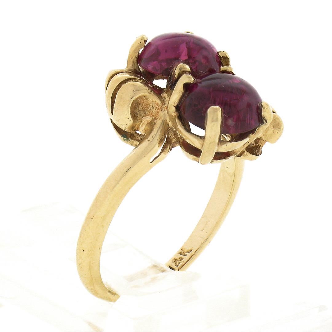 A vintage solid 14k yellow gold bow ring, featuring 2 round cabochon cut natural pink tourmalines (6.8mm each). The ring is size 5.0, weighs a total of 3.48 grams, and measures 13.30mm wide.