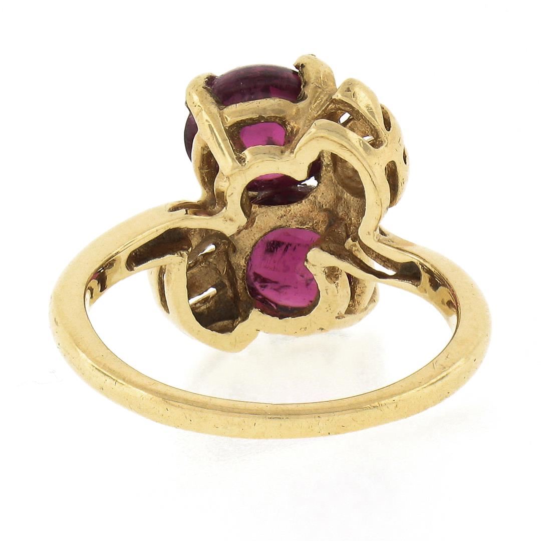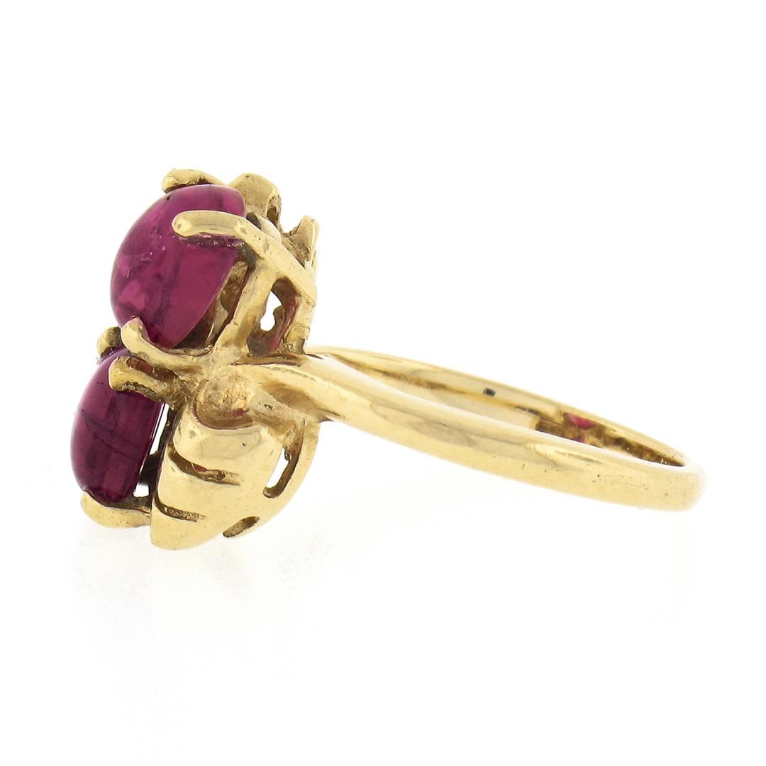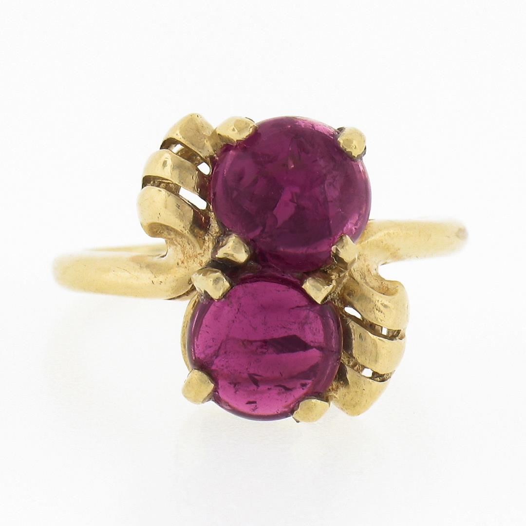 A vintage solid 14k yellow gold bow ring, featuring 2 round cabochon cut natural pink tourmalines (6.8mm each). The ring is size 5.0, weighs a total of 3.48 grams, and measures  13.30mm wide.
