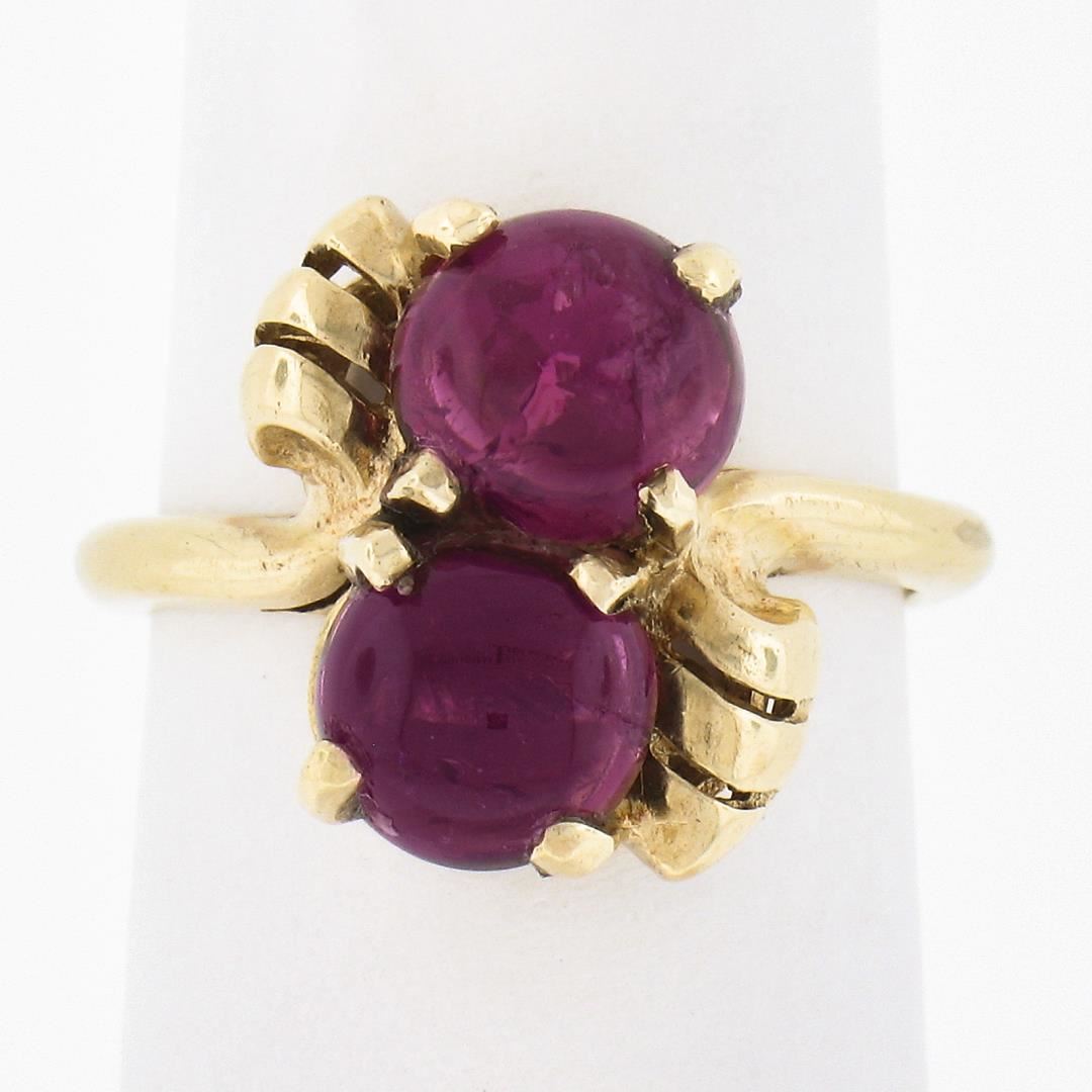 A vintage solid 14k yellow gold bow ring, featuring 2 round cabochon cut natural pink tourmalines (6.8mm each). The ring is size 5.0, weighs a total of 3.48 grams, and measures 13.30mm wide.