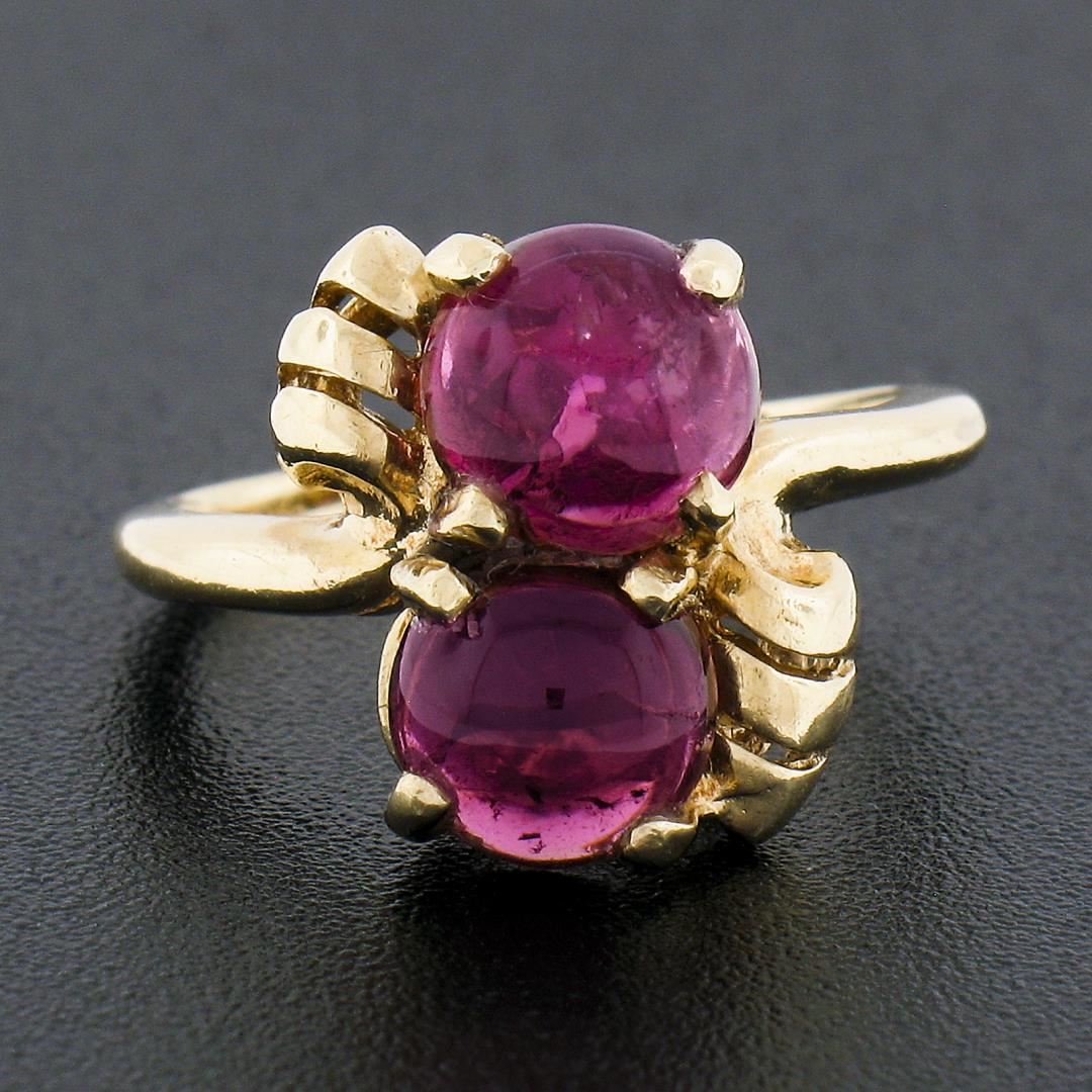 A vintage solid 14k yellow gold bow ring, featuring 2 round cabochon cut natural pink tourmalines (6.8mm each). The ring is size 5.0, weighs a total of 3.48 grams, and measures 13.30mm wide.