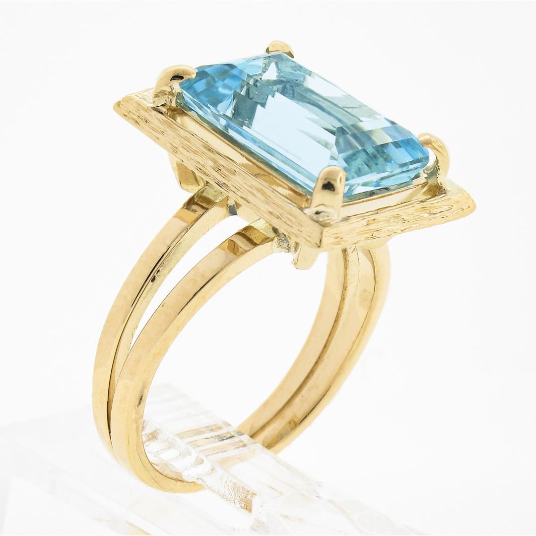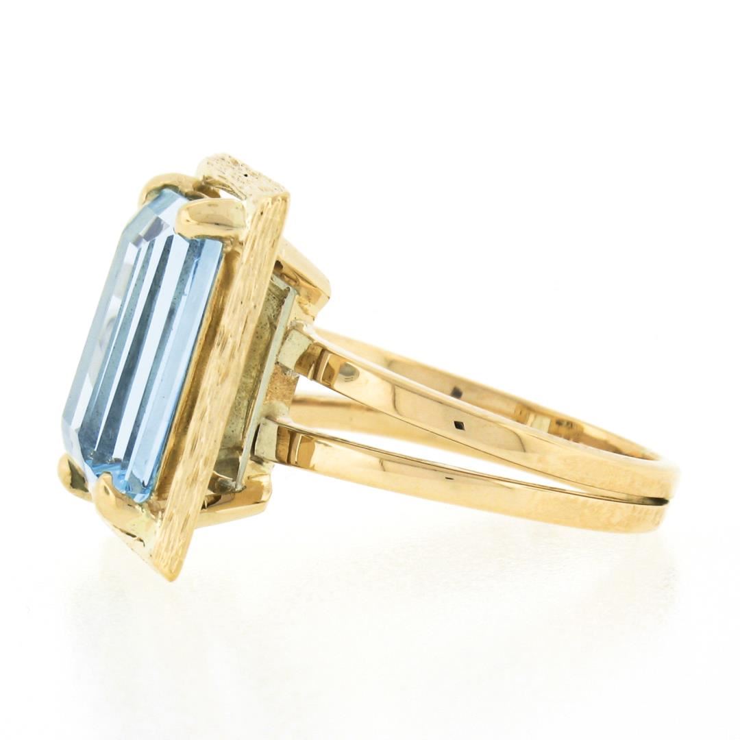 A vintage solid 14k yellow gold ring, with 1 emerald cut natural aquamarine (4.72ct). The ring is size 6.0, weighs a total of 6.03 grams, and measures 16.55mm wide.