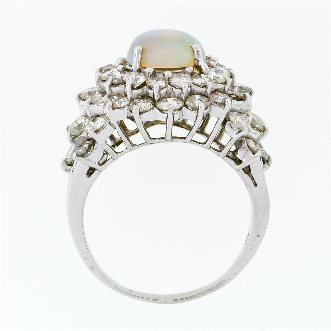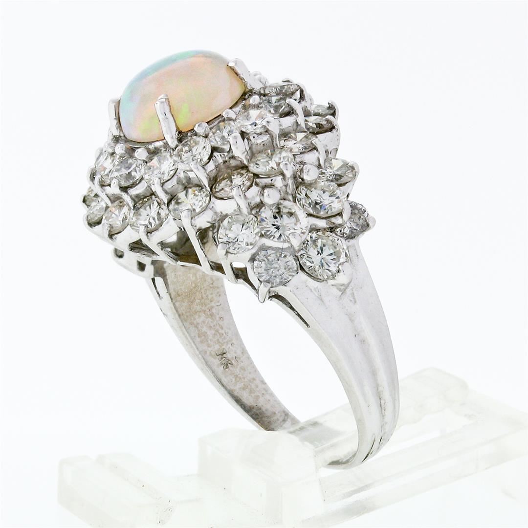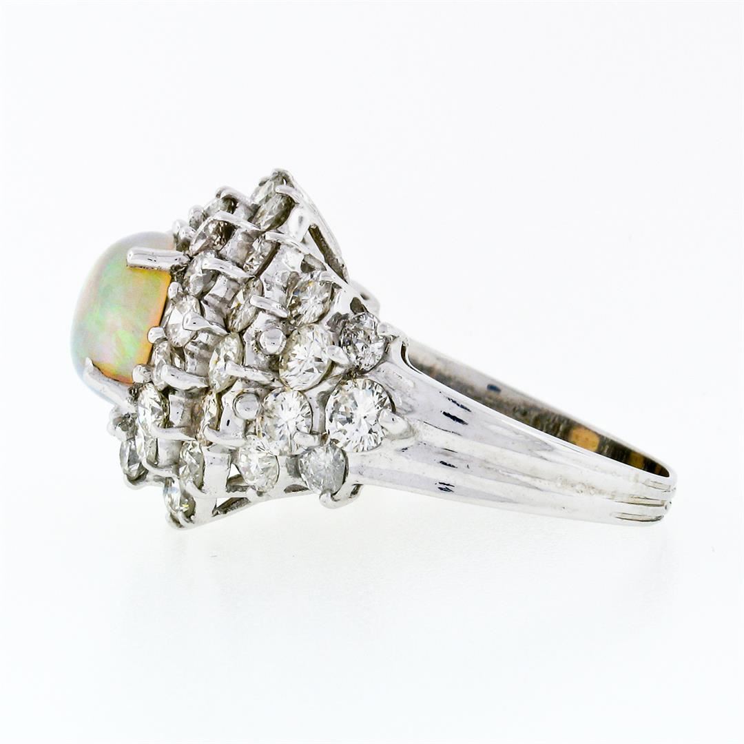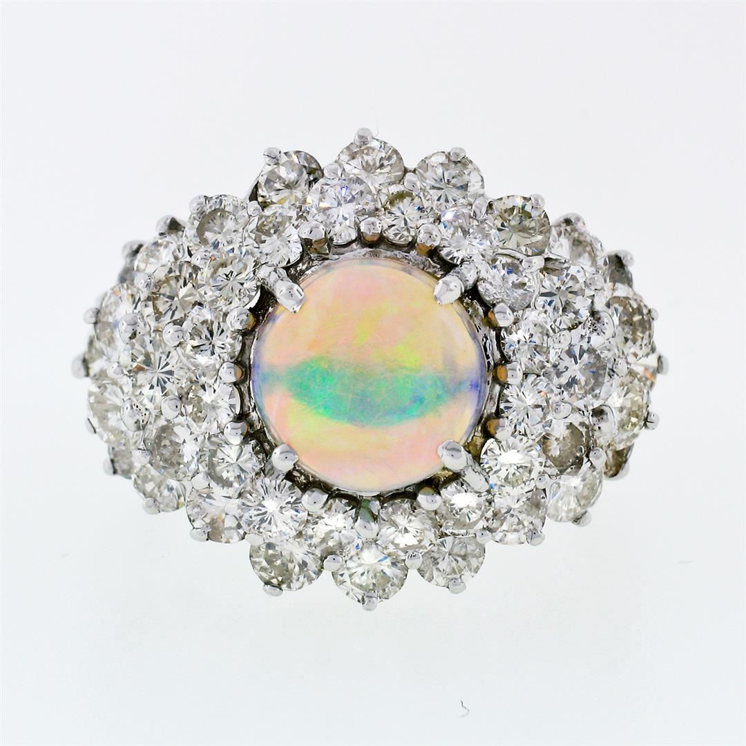 A vintage solid 14k white gold statement ring with 1 round cabochon cut natural opal (9.2mm - 2.00ct) surrounded by 46 round brillaint cut natural diamonds (H/I - VS2 to SI2; 5.50ctw). The ring is size 9.5, weighs a total of 10.47 grams, and measures 24.75mm wide.