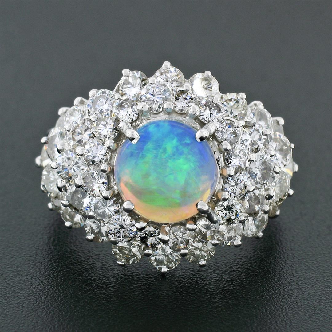 A vintage solid 14k white gold statement ring with 1 round cabochon cut natural opal (9.2mm - 2.00ct) surrounded by 46 round brillaint cut natural diamonds (H/I - VS2 to SI2; 5.50ctw). The ring is size 9.5, weighs a total of 10.47 grams, and measures 24.75mm wide.