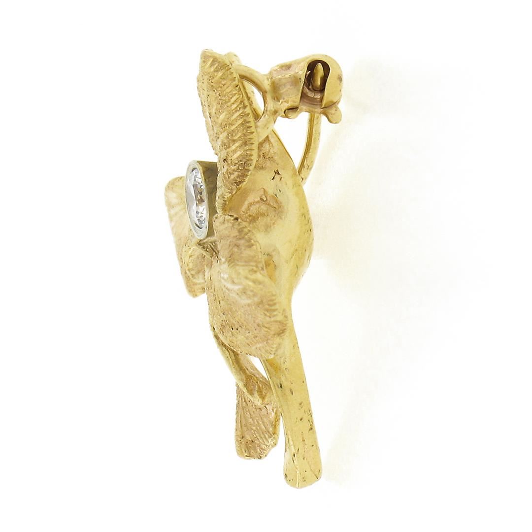 A vintage solid 14k yellow gold pin brooch, with 1 round brilliant cut cubic zirconia (3.1mm). Measures 22.50x21.50mm and weighs a total of 4.45 grams.