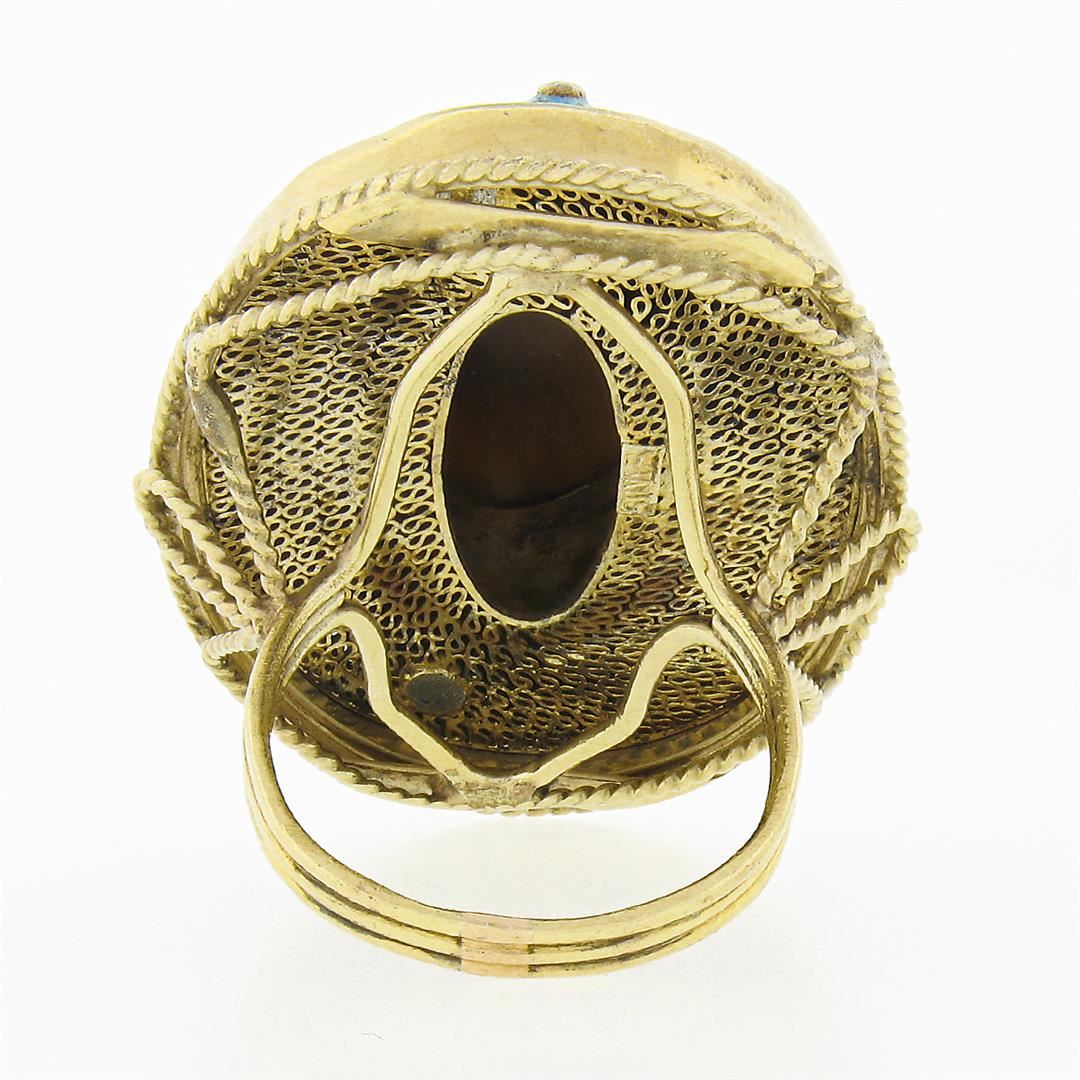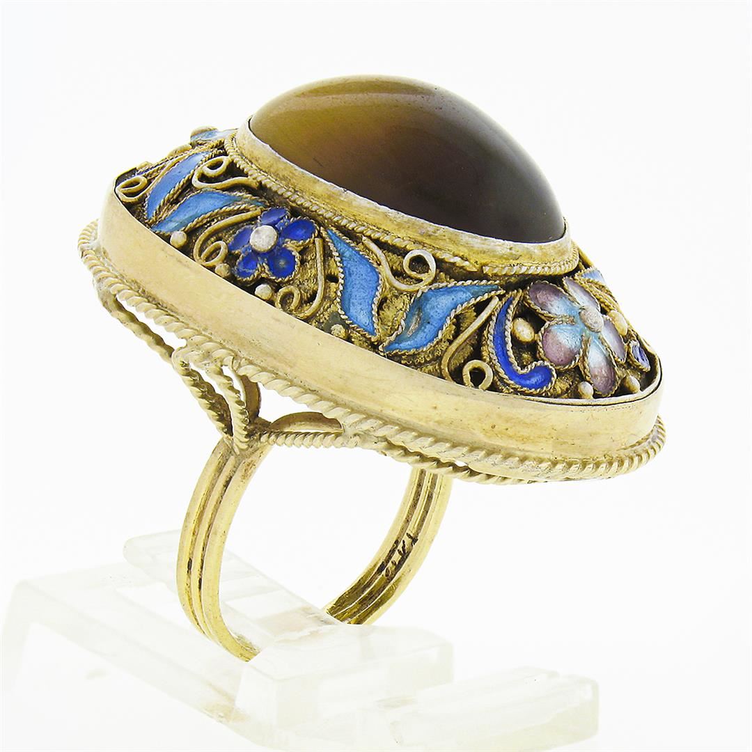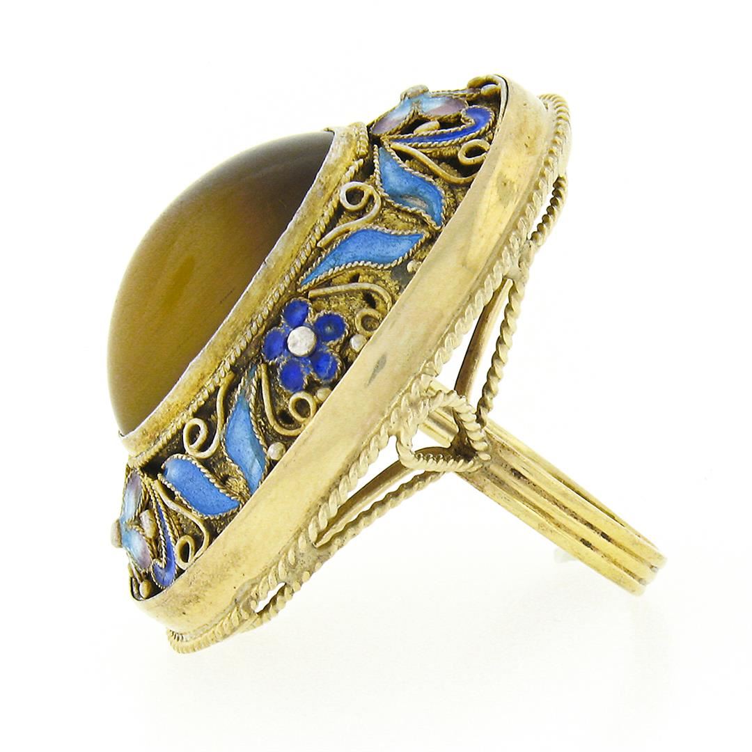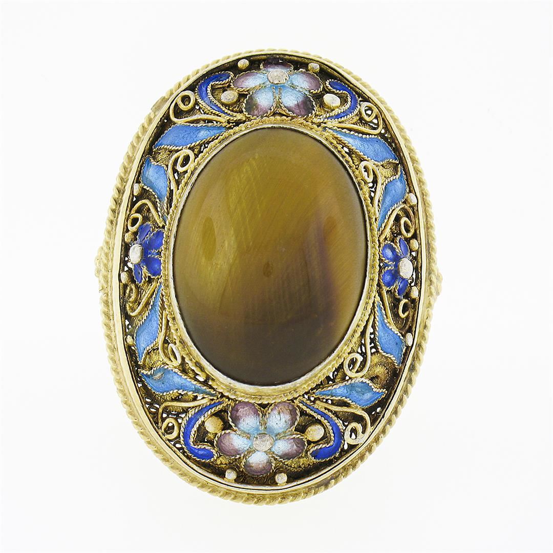 A solid 14k yellow gold statement ring, with 1 oval cabochon cut natural tiger's eye (20.70x15.45mm), and enamel work. The ring is size 7.5, weighs a total of 17.14 grams, and measures 38.50mm wide.