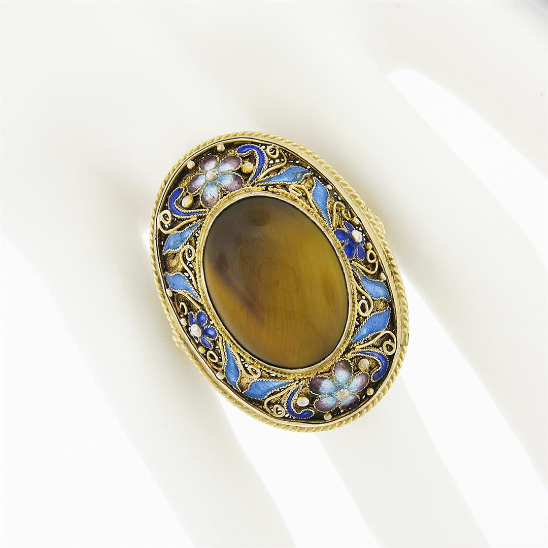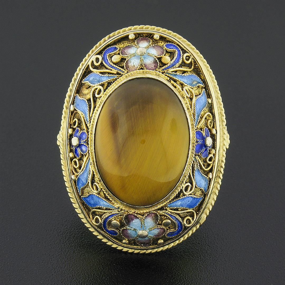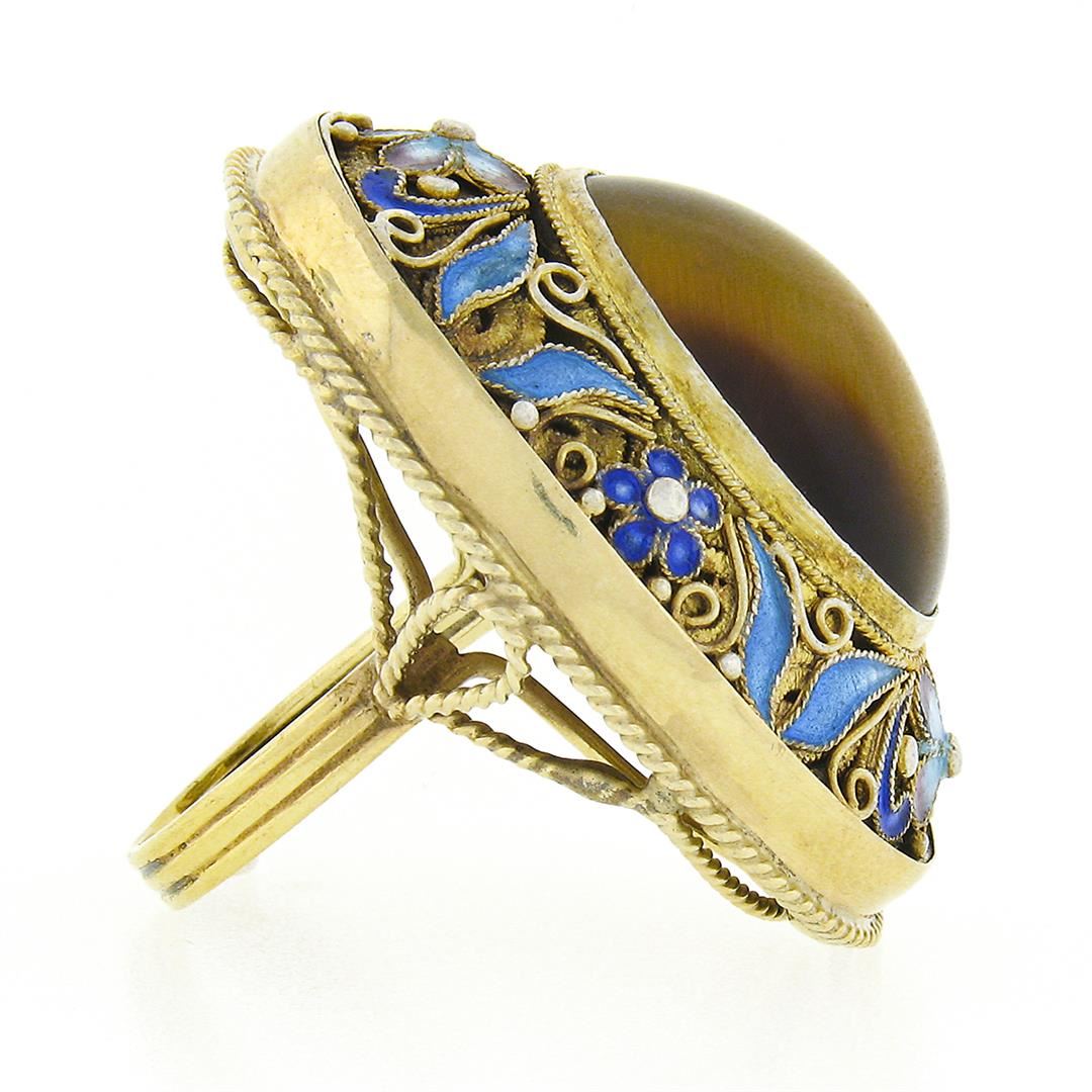 A solid 14k yellow gold statement ring, with 1 oval cabochon cut natural tiger's eye (20.70x15.45mm), and enamel work. The ring is size 7.5, weighs a total of 17.14 grams, and measures 38.50mm wide.