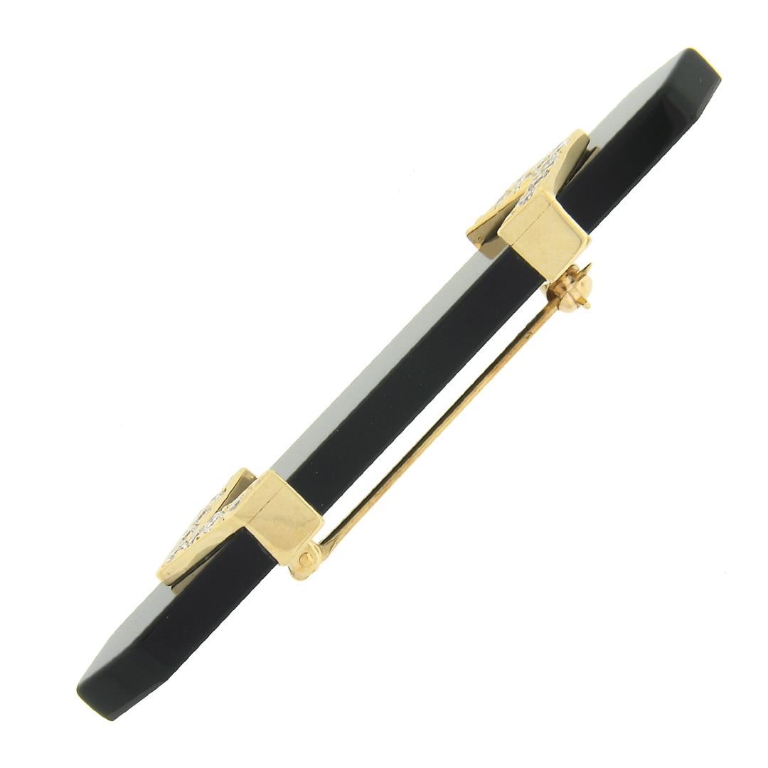 A vintage solid 14k yellow gold bar brooch, with 1 custom cut natural black onyx (59.7x10mm), and 14 round cut natural diamonds (G/H - VS2-SI2 ; 0.42ctw ). Measures 11x59.7mm and weighs a total of 7.38 grams.