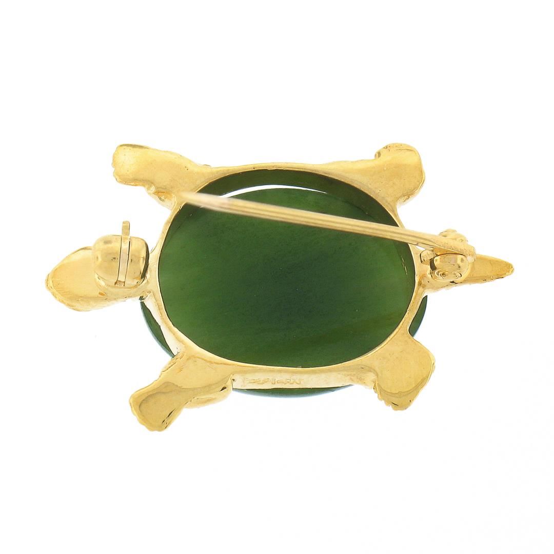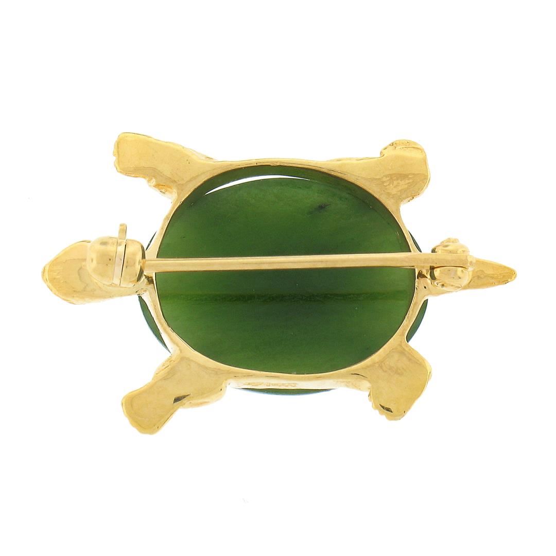 A vintage solid 14k yellow gold brooch, with 1 oval cabochon cut natural jade (15.8x11.9mm). Measures 25.5x16.5mm and weighs a total of 4.42 grams.