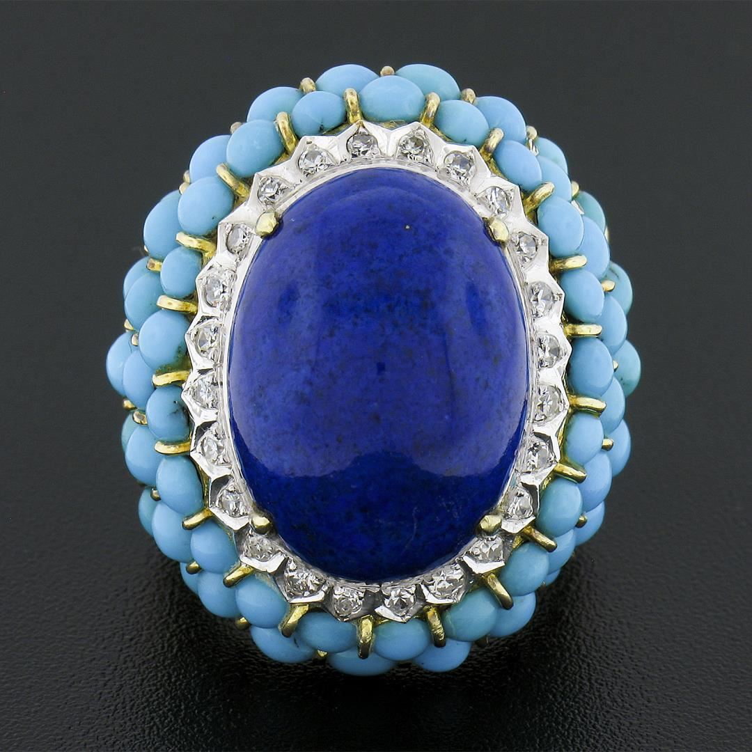 A vintage solid 14k yellow & white gold cocktail ring, with 1 oval cabochon cut natural lapis (19.3x14mm), and 56 round bead natural turquoises (2.8mm to 3.8mm each), and 24 old single cut natural diamonds ( F/G - VS2/SI1 ; 0.35ctw). The ring is size 6.0, weighs a total of 29.49 grams, and measures 29.10mm wide.