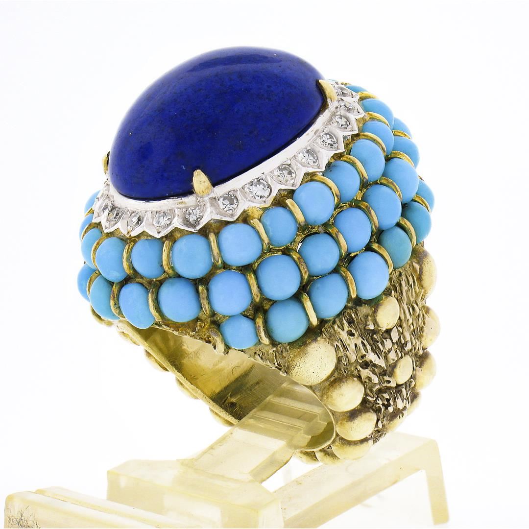 A vintage solid 14k yellow & white gold cocktail ring, with 1 oval cabochon cut natural lapis (19.3x14mm), and 56 round bead natural turquoises (2.8mm to 3.8mm each), and 24 old single cut natural diamonds ( F/G - VS2/SI1 ; 0.35ctw). The ring is size 6.0, weighs a total of 29.49 grams, and measures 29.10mm wide.