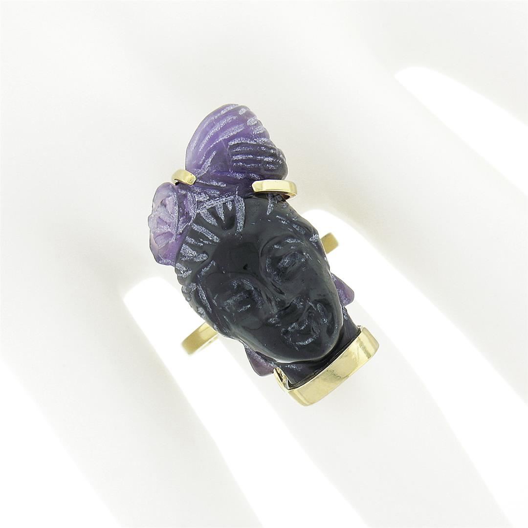 A solid 14k yellow gold ring, with 1 3d carved natural amethyst (25.6x16.5mm). The ring is size 7.5, weighs a total of 12.68 grams, and measures 28.40mm wide.