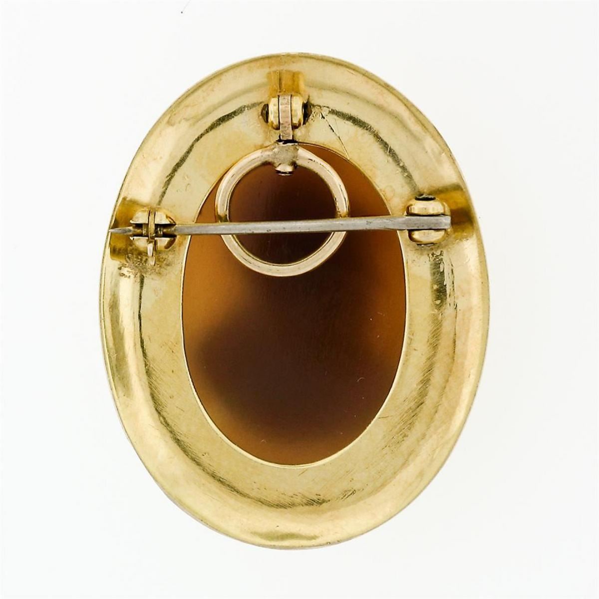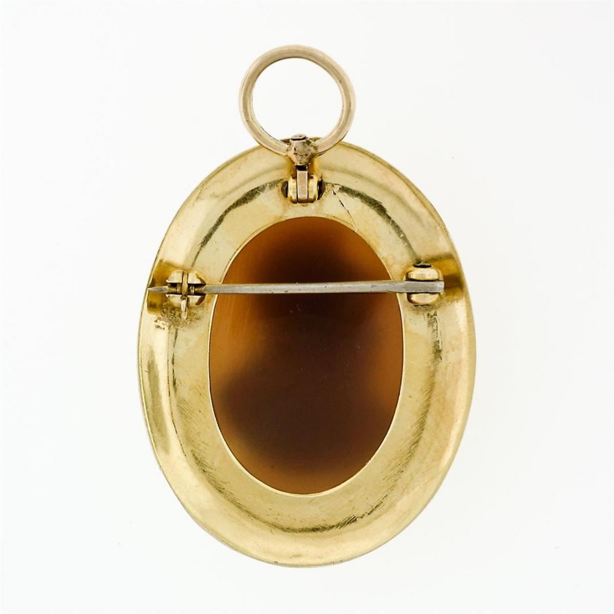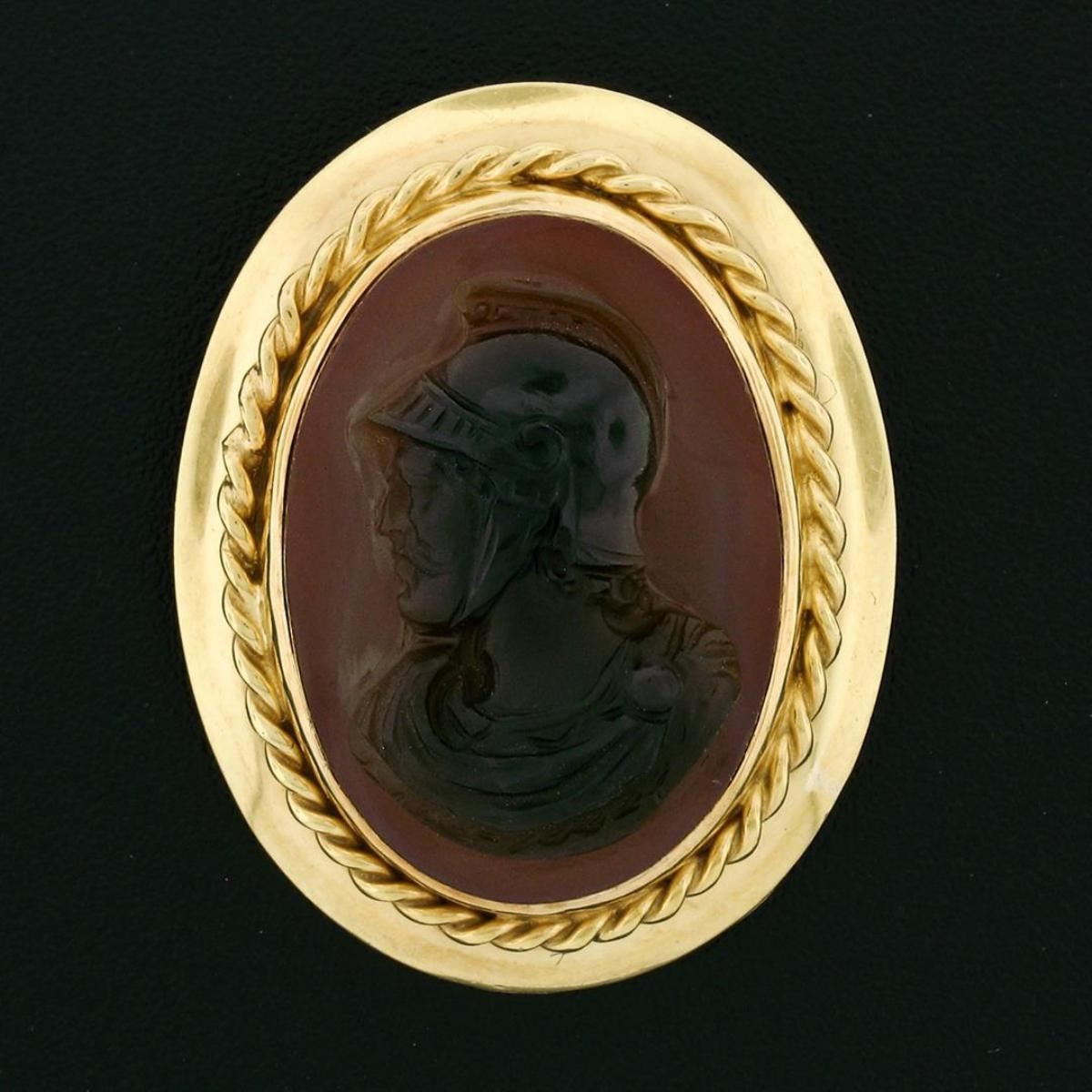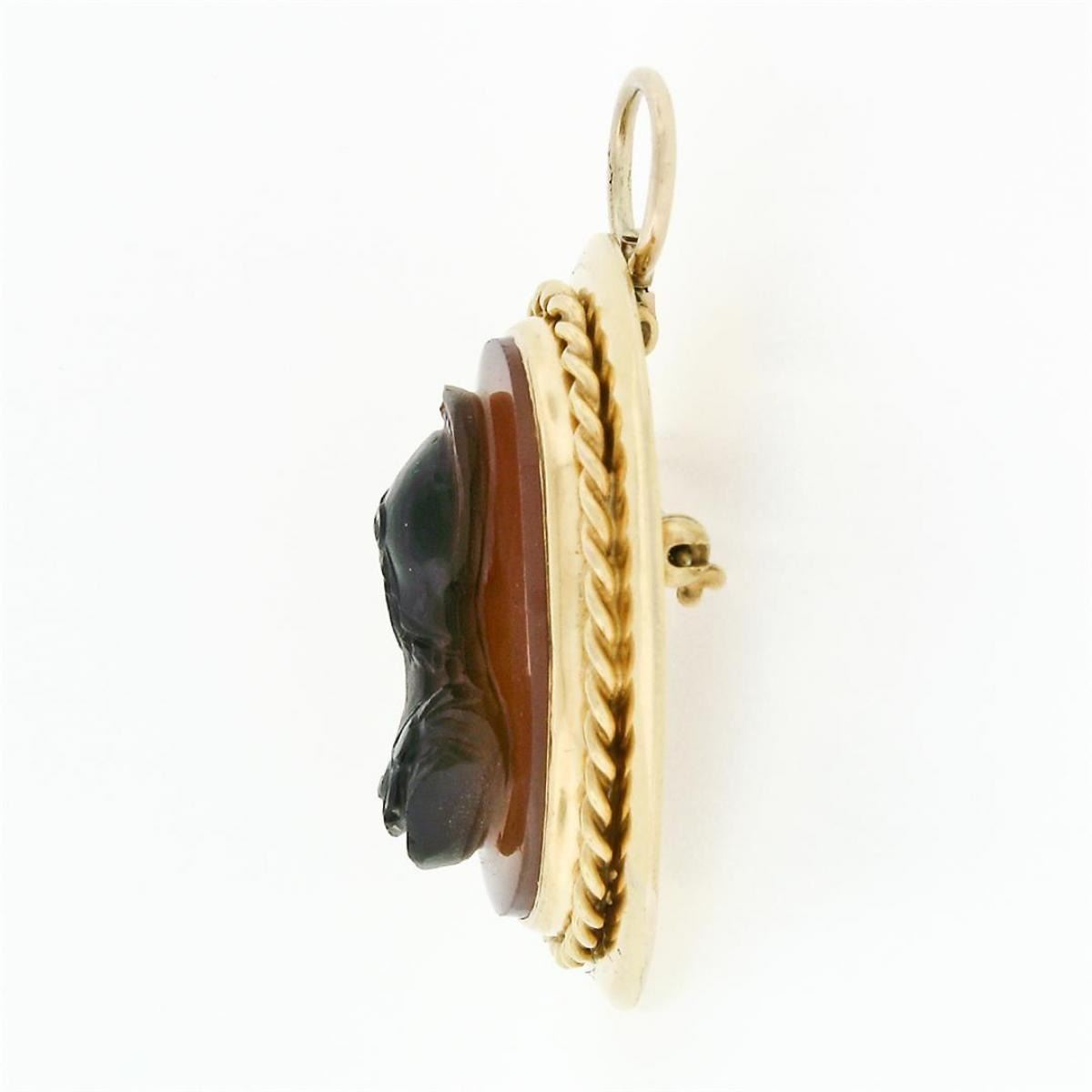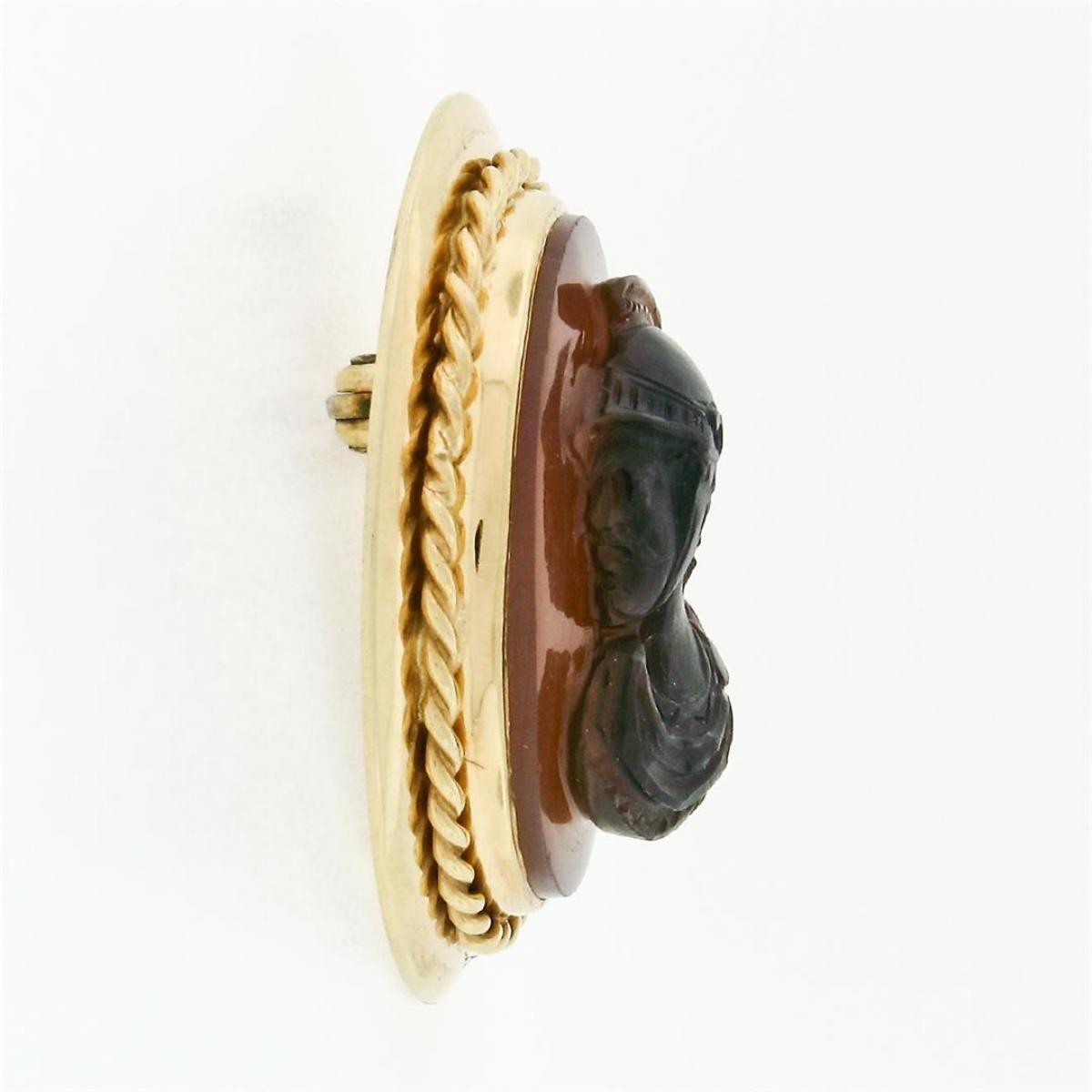 Vintage 14k Gold Carved Brown Agate Trojan Twisted Wire Frame Pin Brooch Pendant. A vintage solid 14k yellow gold pendant featuring an oval carved natural brown agate (23.50x16.85mm) surrounded by a twisted gold wire frame. The pendant weighs a total of 9.70 grams, measures 38.1x24.8mm including the bail, and the inside of the bail measures 6.5mm in diameter.