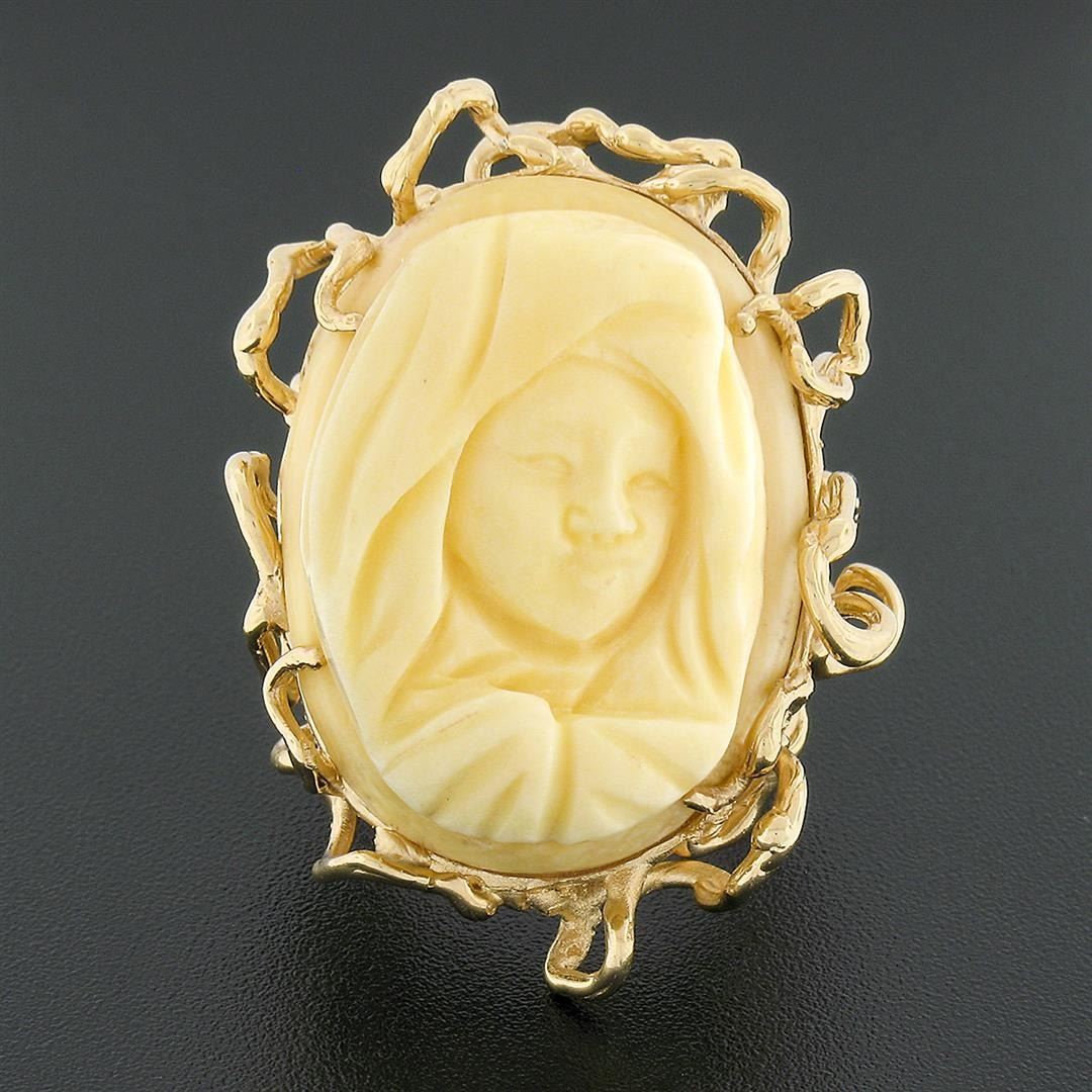 A vintage solid 14k yellow gold ring, with 1 carved oval shape cameo (29.90x22.80mm). The ring is size 7.5, weighs a total of 22.12 grams, and measures 39.20mm wide.
