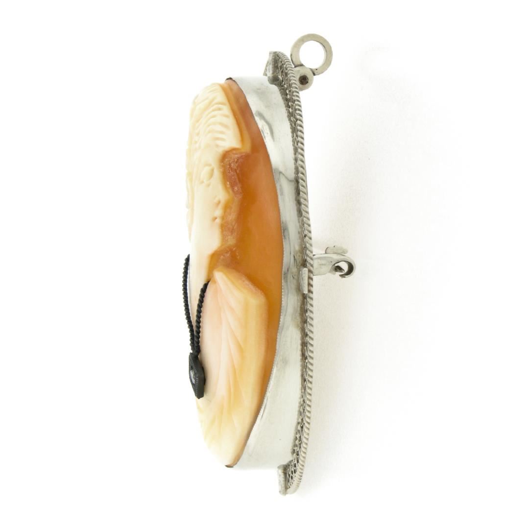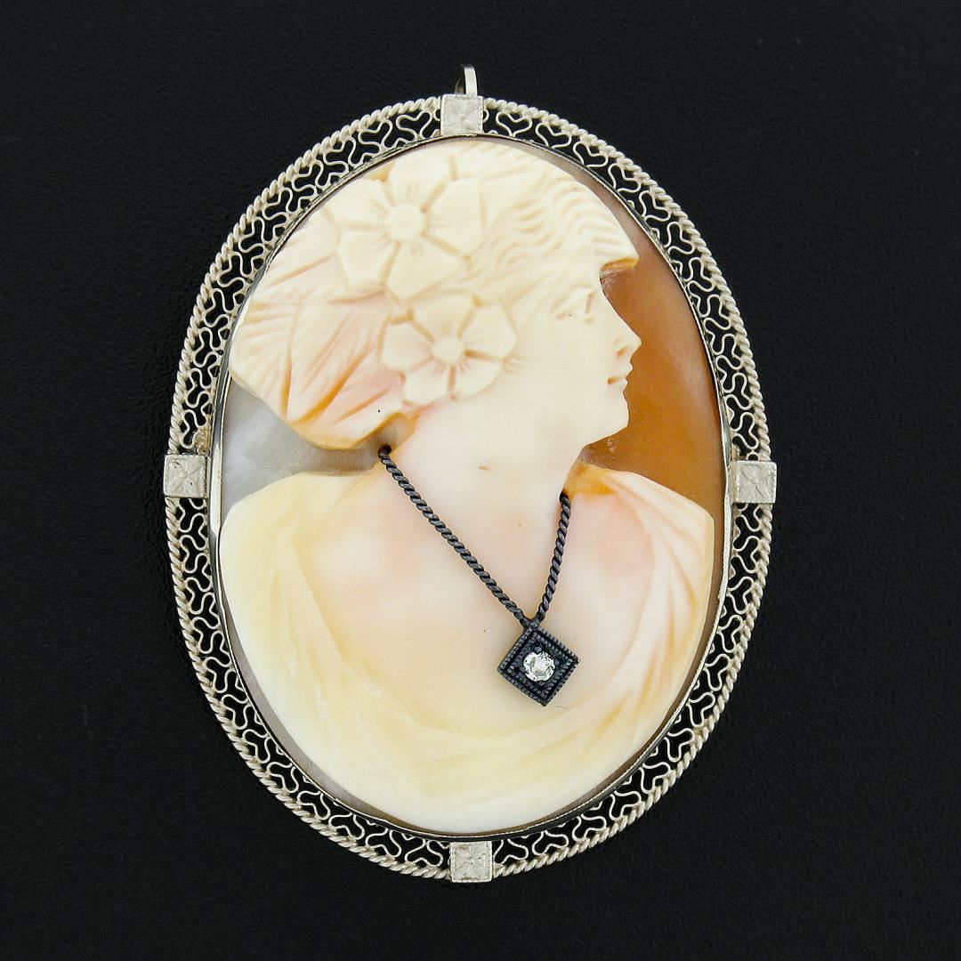 A vintage solid 14k white gold brooch pendant, with 1 oval shape carved shell cameo (39.1x28.8mm), and 1 old single cut natural diamonds (J - VS2 ; 0.03ct).. Measures 47.1x35.2mm and weighs a total of 11.96 grams.