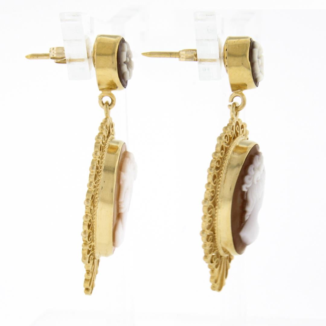 A vintage solid 14k yellow gold dangle earrings. with 4 carved cameo shells. The earrings measure approximately 35.80x18.80mm and weigh a total of 5.76 grams.