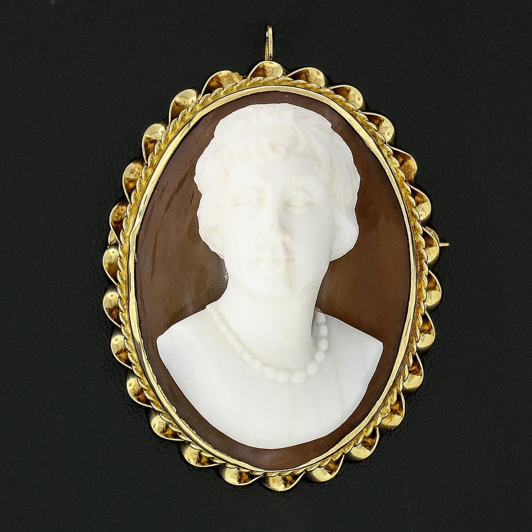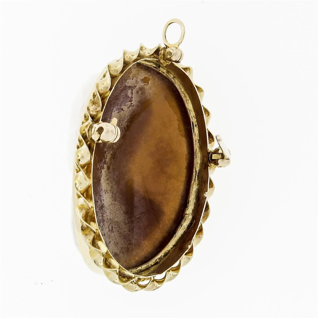 A vintage solid 14k yellow gold pendant pin brooch, with 1 oval cut carved shell cameo (29.5x22mm). Measures 35x27.5mm and weighs a total of 7.93 grams.