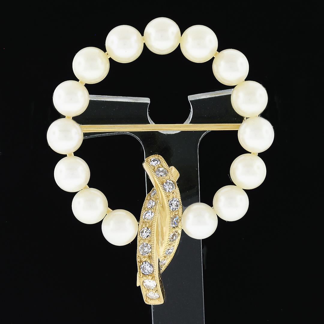 A vintage solid 14k yellow gold wreath pin brooch, with 16 single cut natural diamonds ( F/G - VVS2/VS1 ; 0.32ctw), and 15 round shape cultured pearls (5.0mm each). Measures 40.60x31.20mm and weighs a total of 7.93 grams.