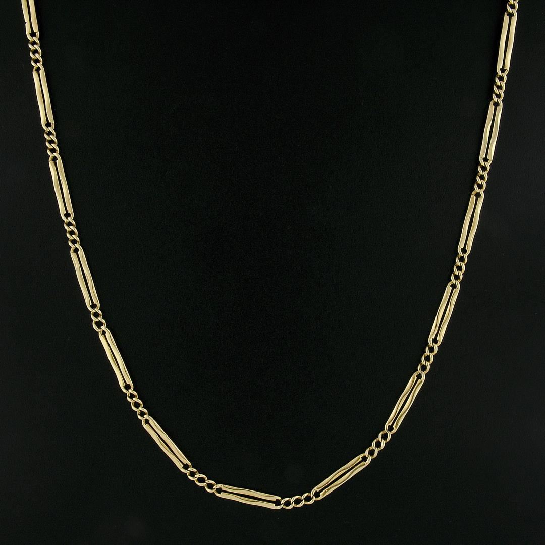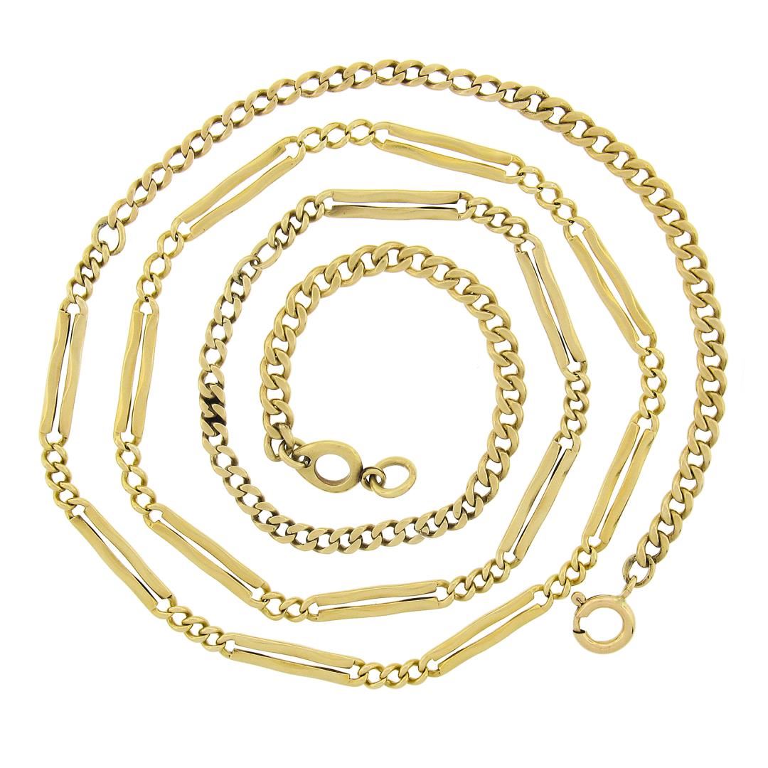 a vintage solid 14k yellow gold curb & open bar link chain necklace. It weighs a total of 40.7 grams, measures 4.8mm wide, and measures 32 inches in length.