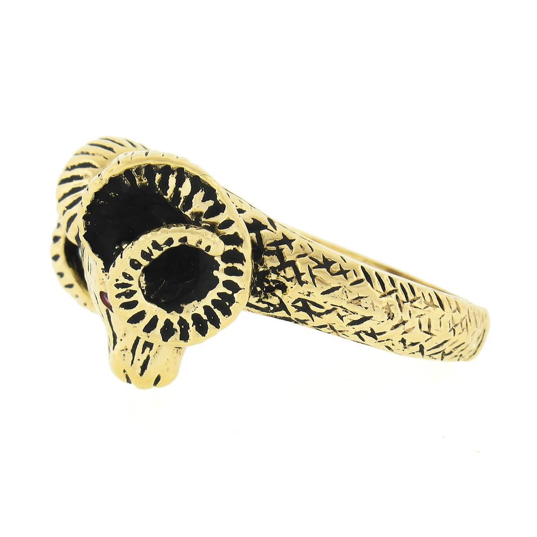 A vintage solid 14k yellow gold ram ring, with 1 round cut natural rubies (0.06ctw). The ring is size 6.0, weighs a total of 9.36 grams, and measures 14.7mm wide.