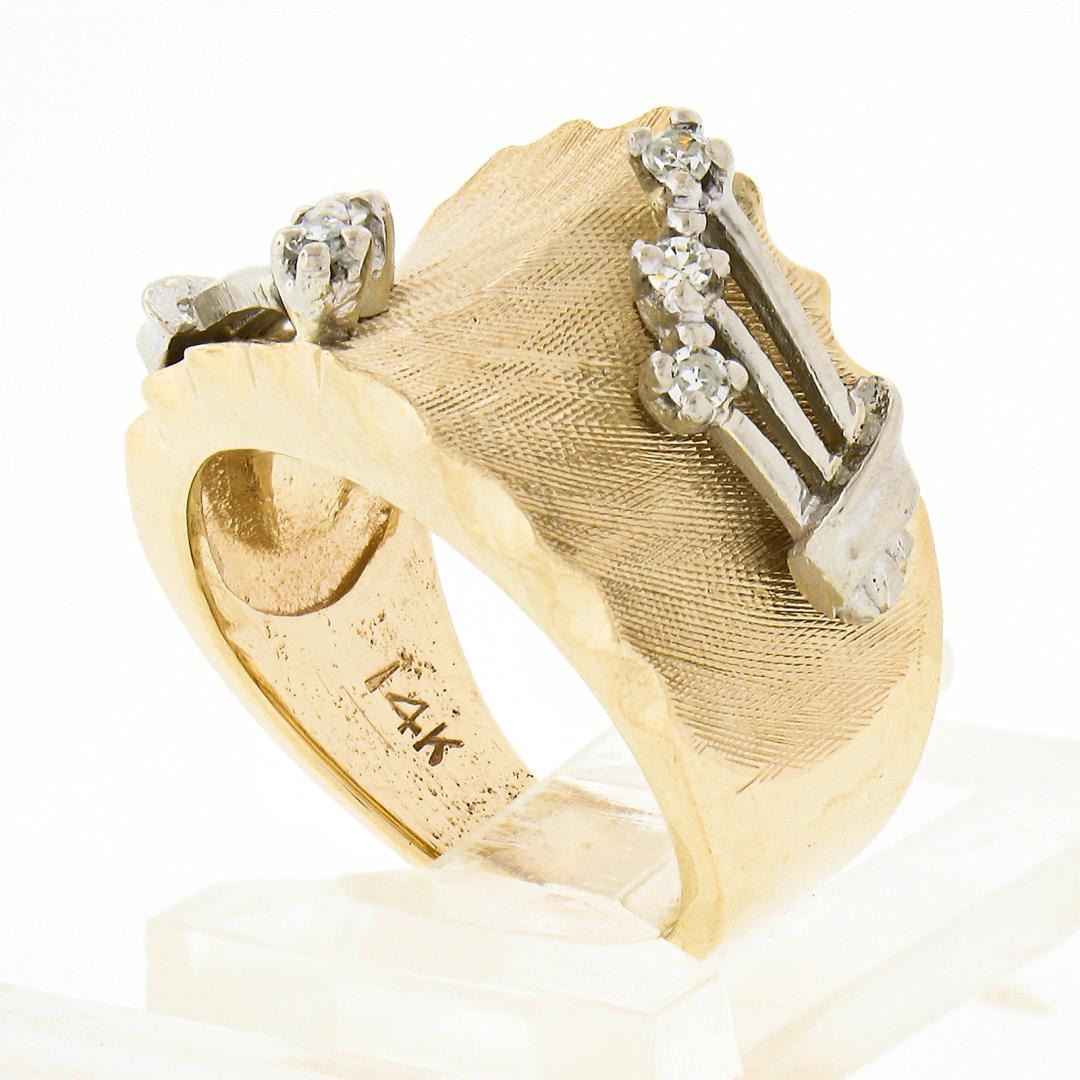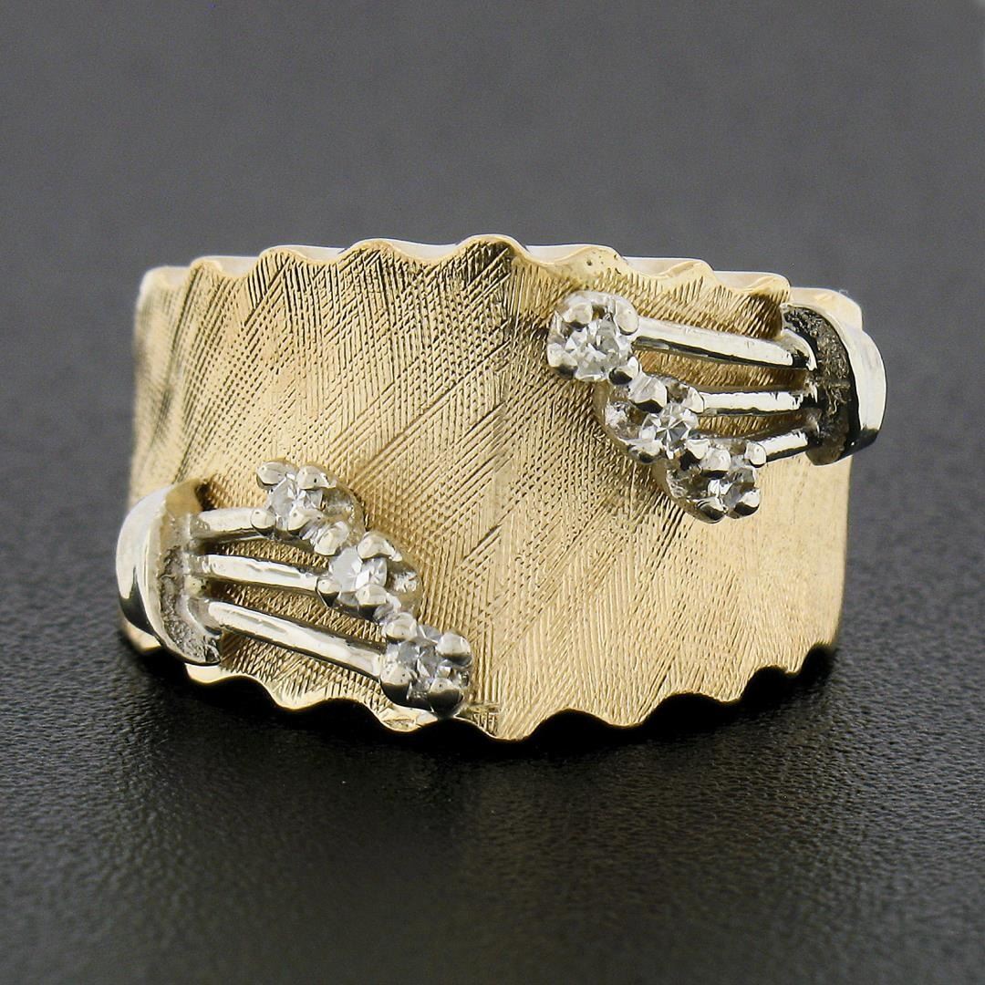 a vintage solid 14k yellow & white gold wide band ring. with 6 old single cut natural diamonds (G/H - SI1/SI2 ; 0.09ctw). The ring is size 3.5, weighs a total of 6.71 grams, and measures 12mm wide.