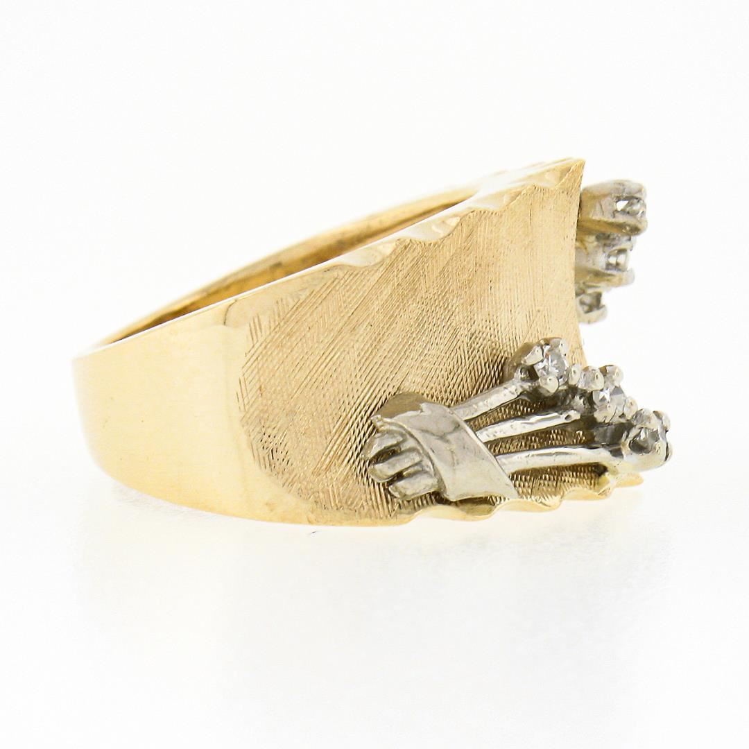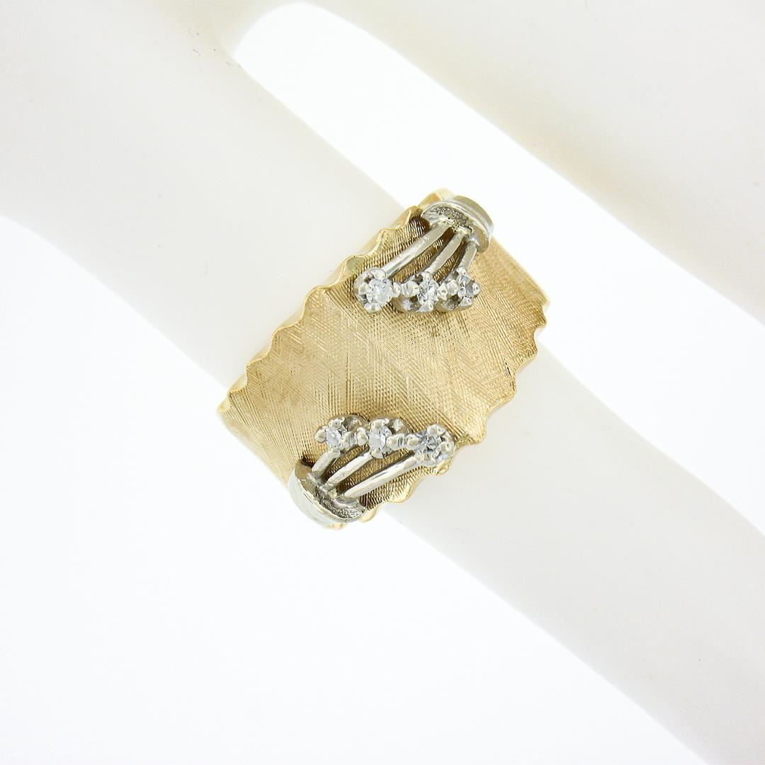 a vintage solid 14k yellow & white gold wide band ring. with 6 old single cut natural diamonds (G/H - SI1/SI2 ; 0.09ctw). The ring is size 3.5, weighs a total of 6.71 grams, and measures 12mm wide.