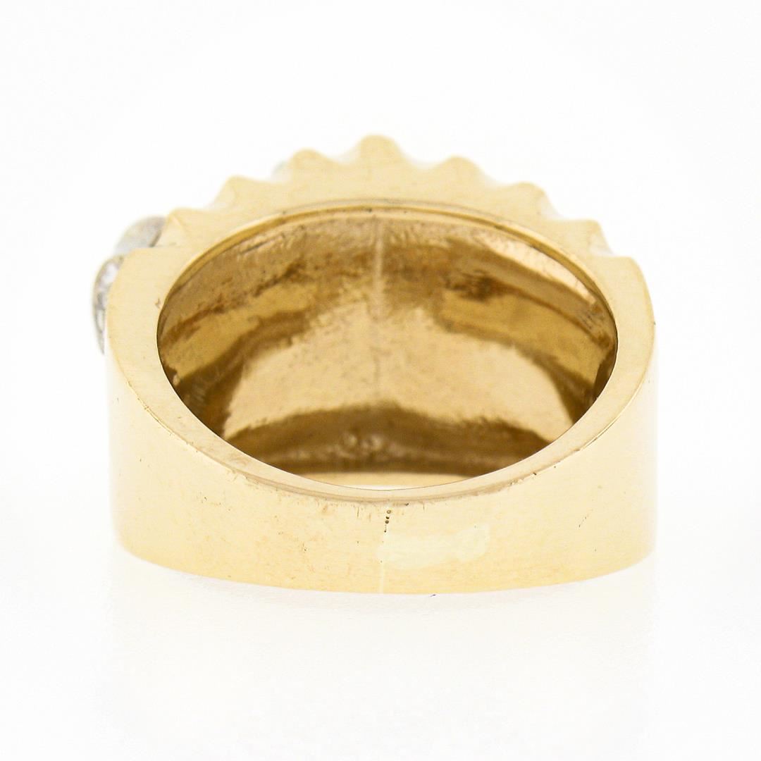 a vintage solid 14k yellow & white gold wide band ring. with 6 old single cut natural diamonds (G/H - SI1/SI2 ; 0.09ctw). The ring is size 3.5, weighs a total of 6.71 grams, and measures 12mm wide.