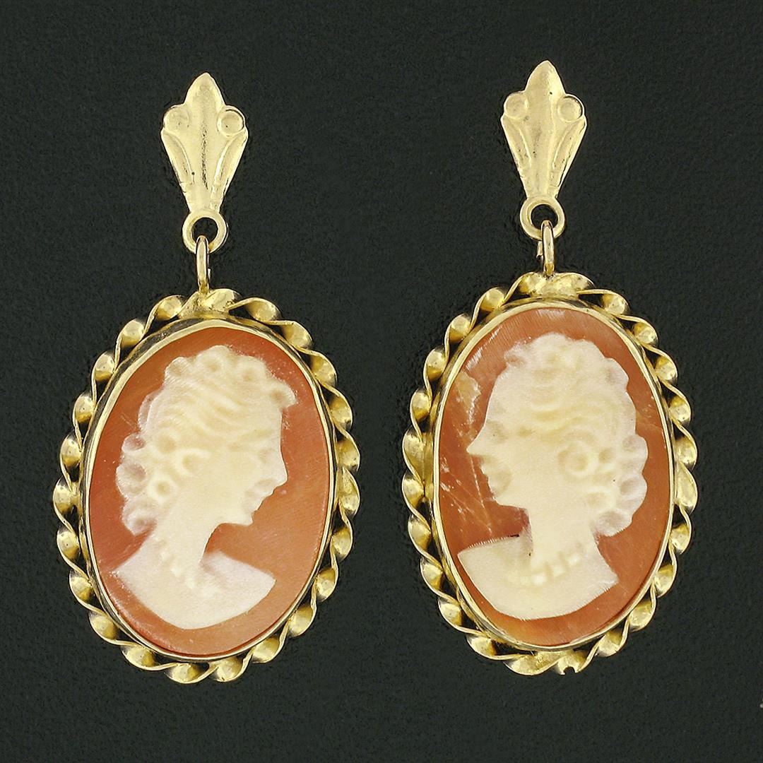 A vintage solid 14k yellow gold dangle drop earrings, with 2 oval shape carved shell cameo (14.35x9.85mm). The earrings measure approximately 25.8x12.55mm and weigh a total of 2.65 grams.