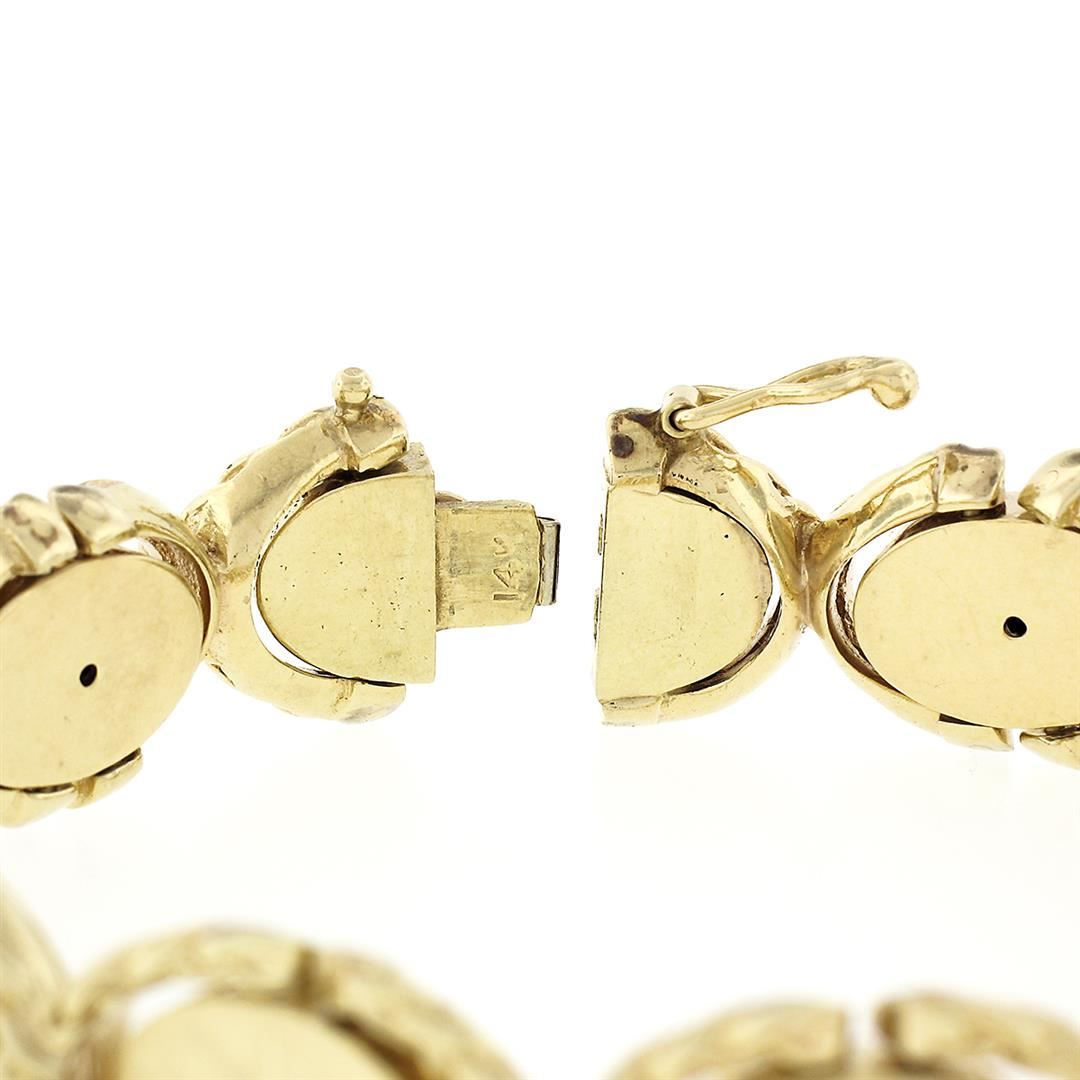 A vintage solid 14k yellow gold oval link bracelet, featuring 9 old transitional cut natural diamonds (F - VS2 ; 0.14ctw). It weighs a total of 38.1 grams, measures 13.5mm wide, and measures 6.5 inches in length.