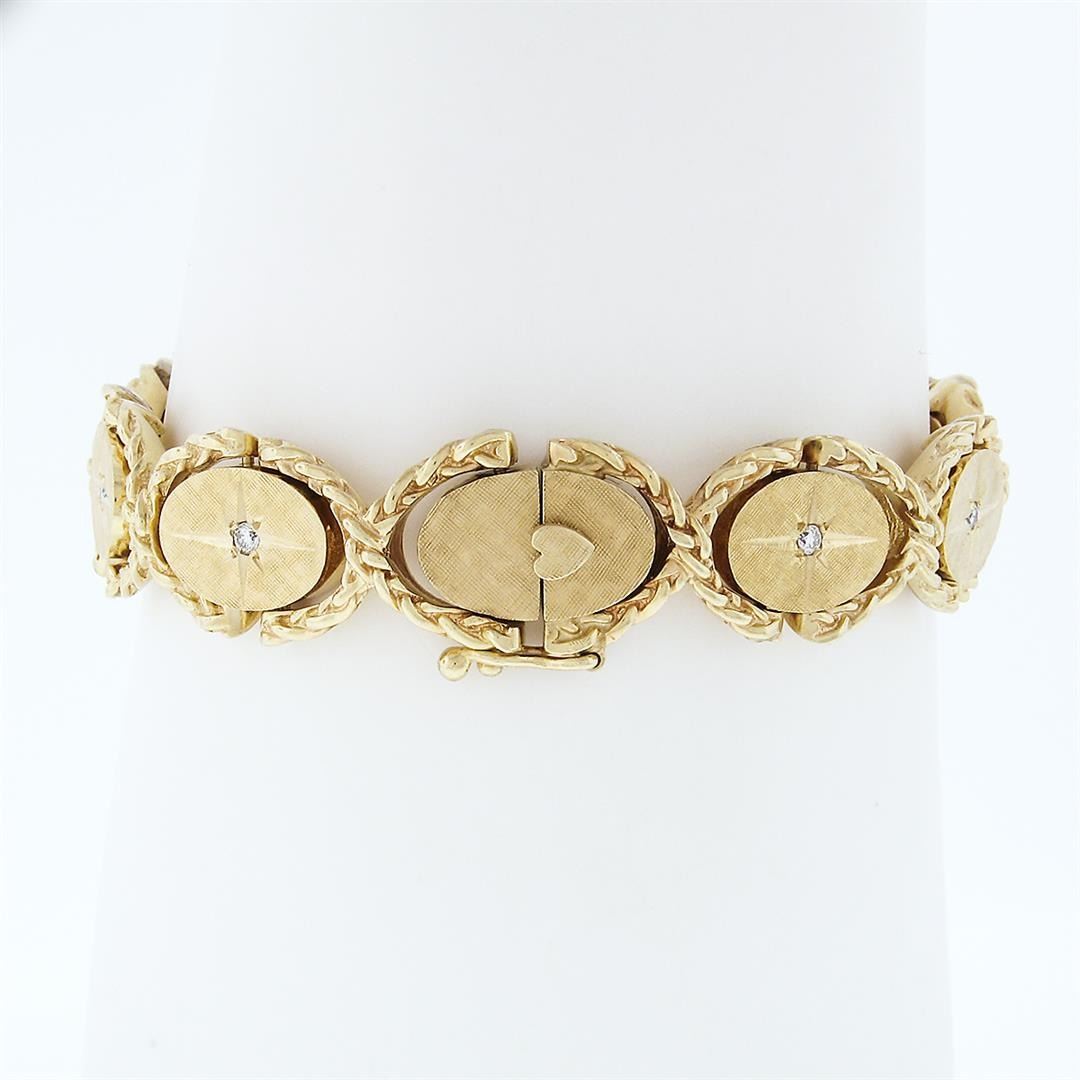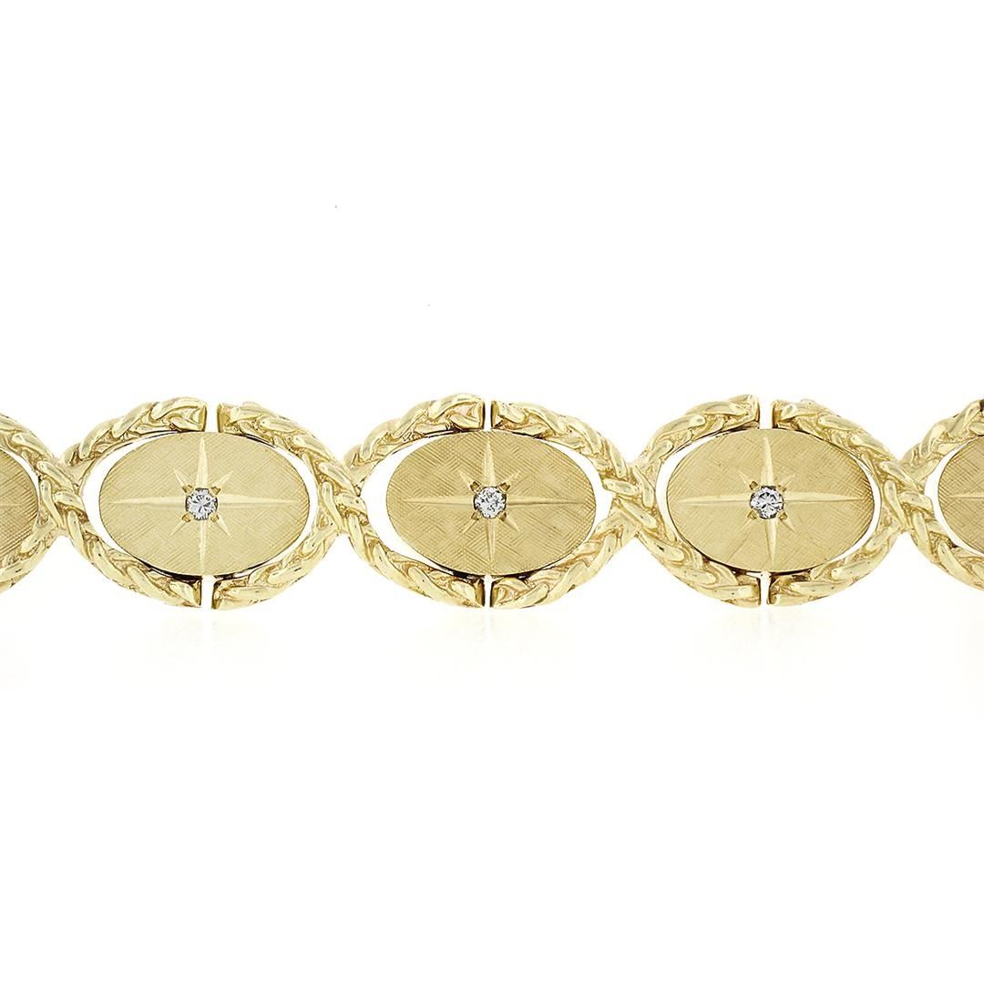 A vintage solid 14k yellow gold oval link bracelet, featuring 9 old transitional cut natural diamonds (F - VS2 ; 0.14ctw). It weighs a total of 38.1 grams, measures 13.5mm wide, and measures 6.5 inches in length.