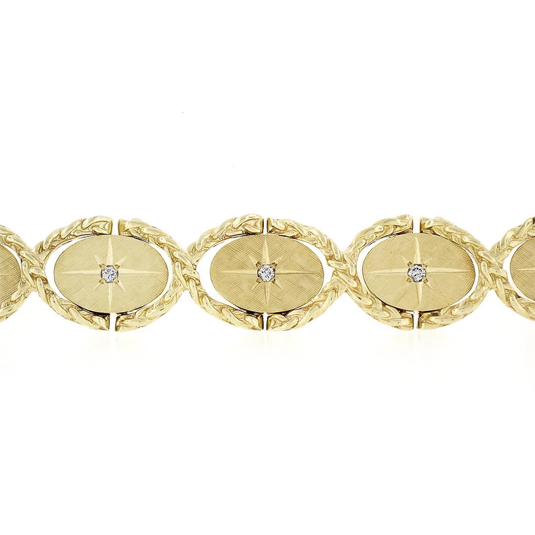 A vintage solid 14k yellow gold oval link bracelet, featuring 9 old transitional cut natural diamonds (F - VS2 ; 0.14ctw). It weighs a total of 38.1 grams, measures 13.5mm wide, and measures 6.5 inches in length.